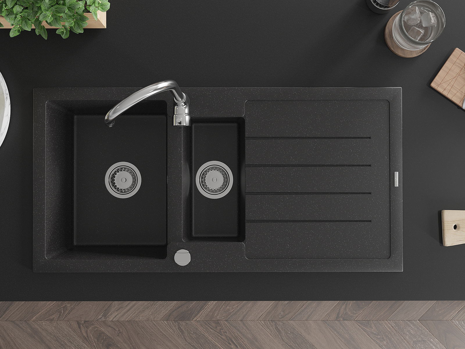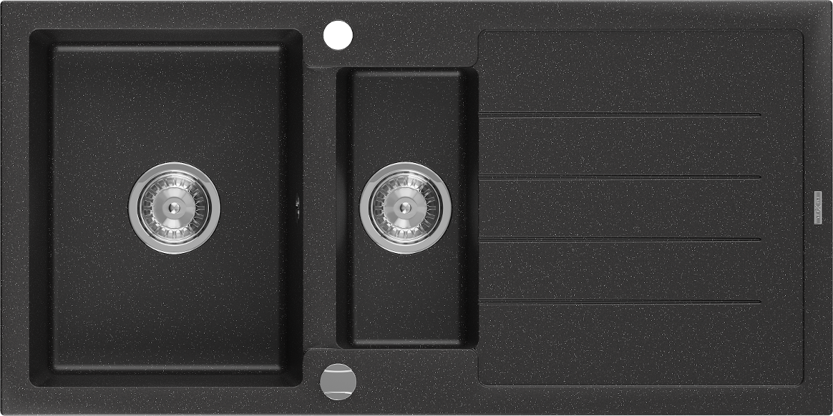 Mexen Andres 1,5-medencés gránit mosogató csepegtetővel 1000 x 500 mm, fekete/ezüst metál, krómozott szifon - 6515101510-73