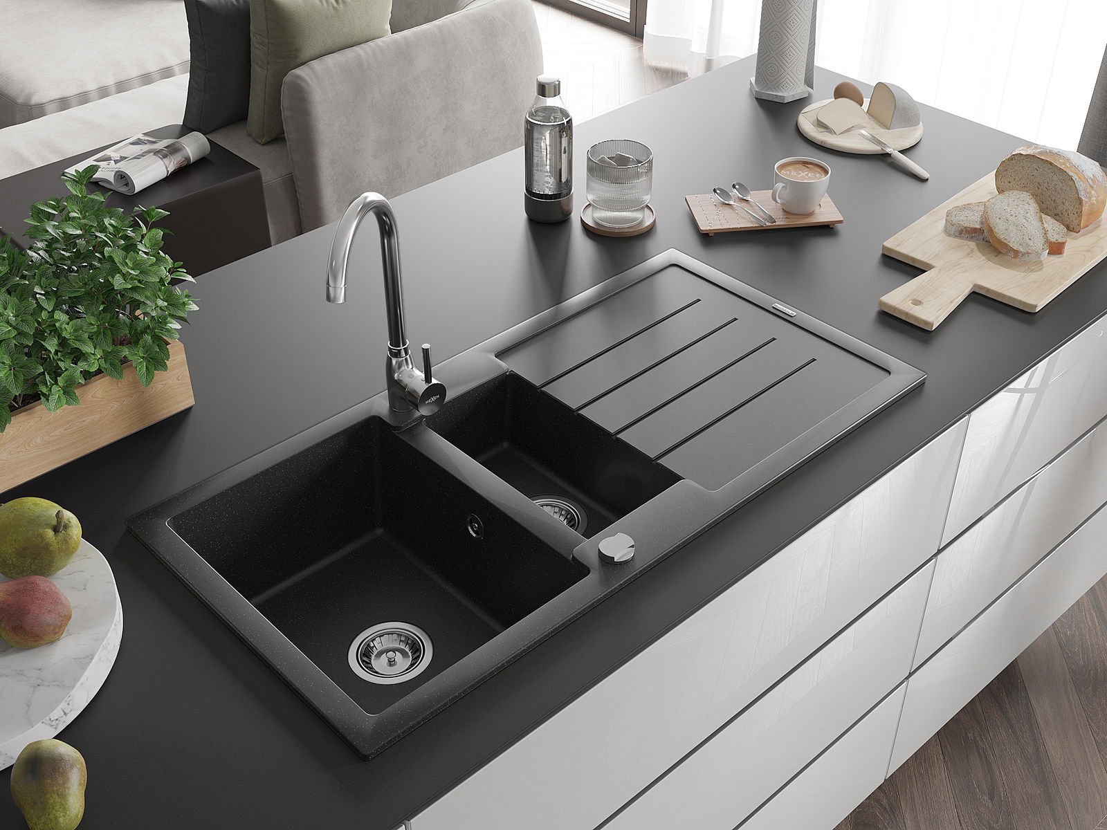 A mosogató kiváló minőségű gránitból készül. Ez egy elegáns és mindenekelőtt minden konyhához praktikus kiegészítés, stílusától függetlenül. A kiváló minőségű és a gránit tartósság biztosítja a sok éves használatát.