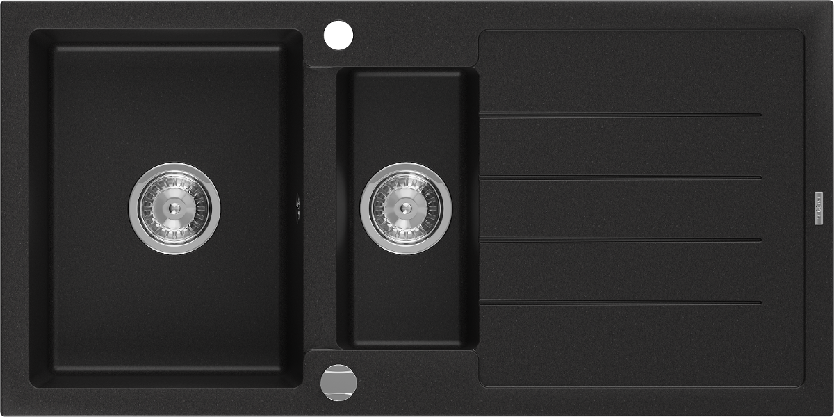 A mosogató 2 összekapcsolt lyukkal rendelkezik, amelynek átmérője 35 mm, önmagában. Felhasználhatók többek között Olyan folyékony adagoló rögzítéséhez, amely kiküszöböli a műanyag palackok jelenlétét a konyhában, és elegáns kivitelben adja meg.
