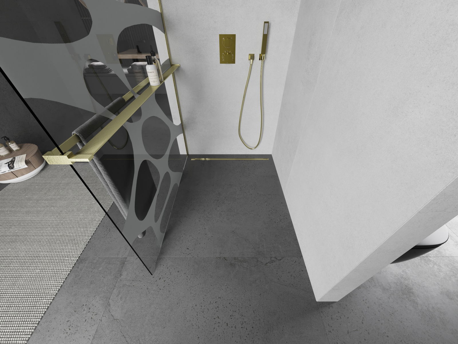 Mexen Kioto+ L zuhanyfal polccal Walk-in 80 x 200 cm, fehér hullám, arany szálcsiszolt - 800-080-123-55-97