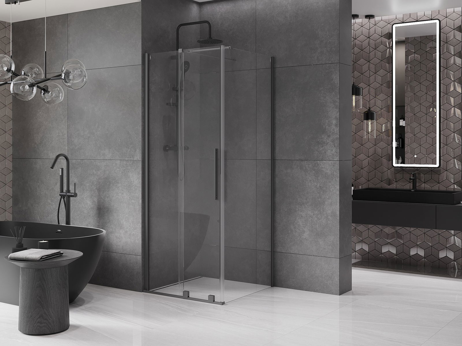 A praktikus és kényelmes fogantyú rozsdamentes acélból készült. A divatos forma a profilok színéhez igazított kivitelezéssel modern és stílusos megjelenést kölcsönöz az egésznek, kiemelve minden fürdőszoba esztétikáját.