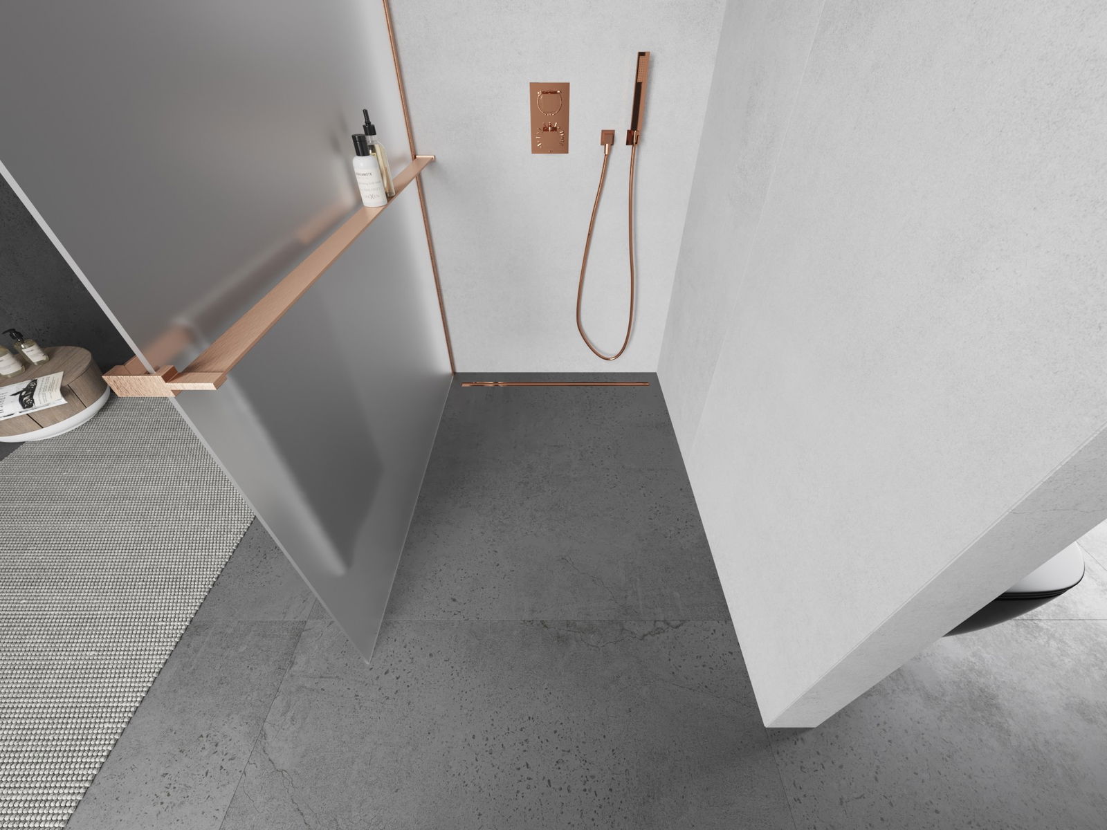 Mexen Kioto+ L zuhanyfal polccal Walk-in 80 x 200 cm, deres, kefeért réz - 800-080-123-65-30