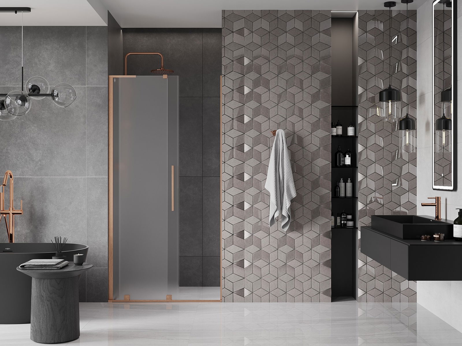 A praktikus és kényelmes fogantyú rozsdamentes acélból készült. A divatos forma a profilok színéhez igazított kivitelezéssel modern és stílusos megjelenést kölcsönöz az egésznek, kiemelve minden fürdőszoba esztétikáját.