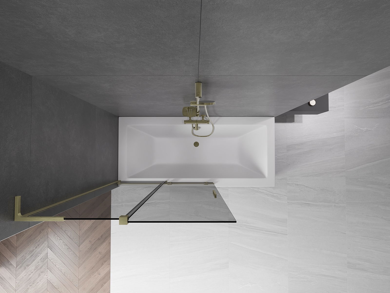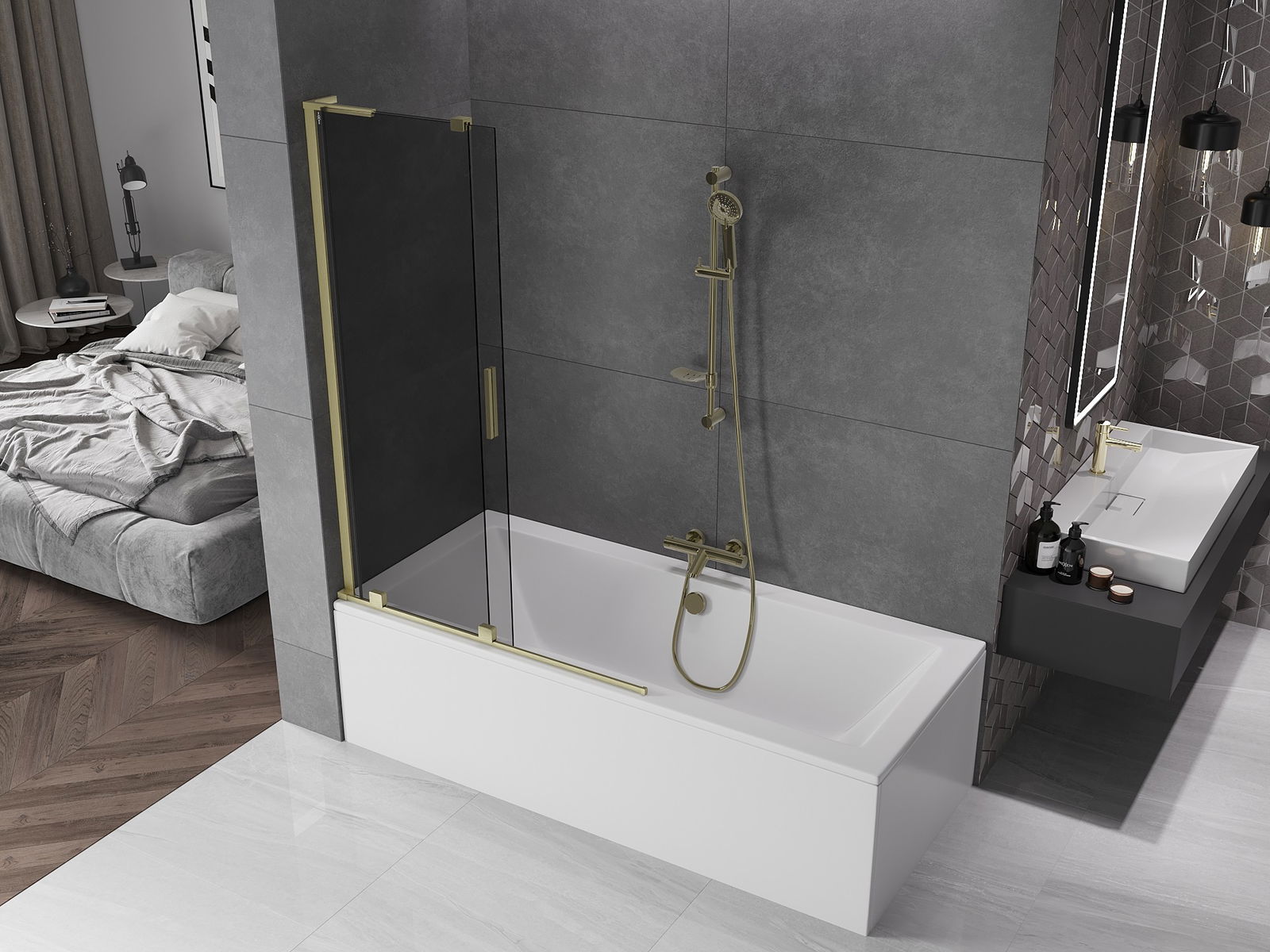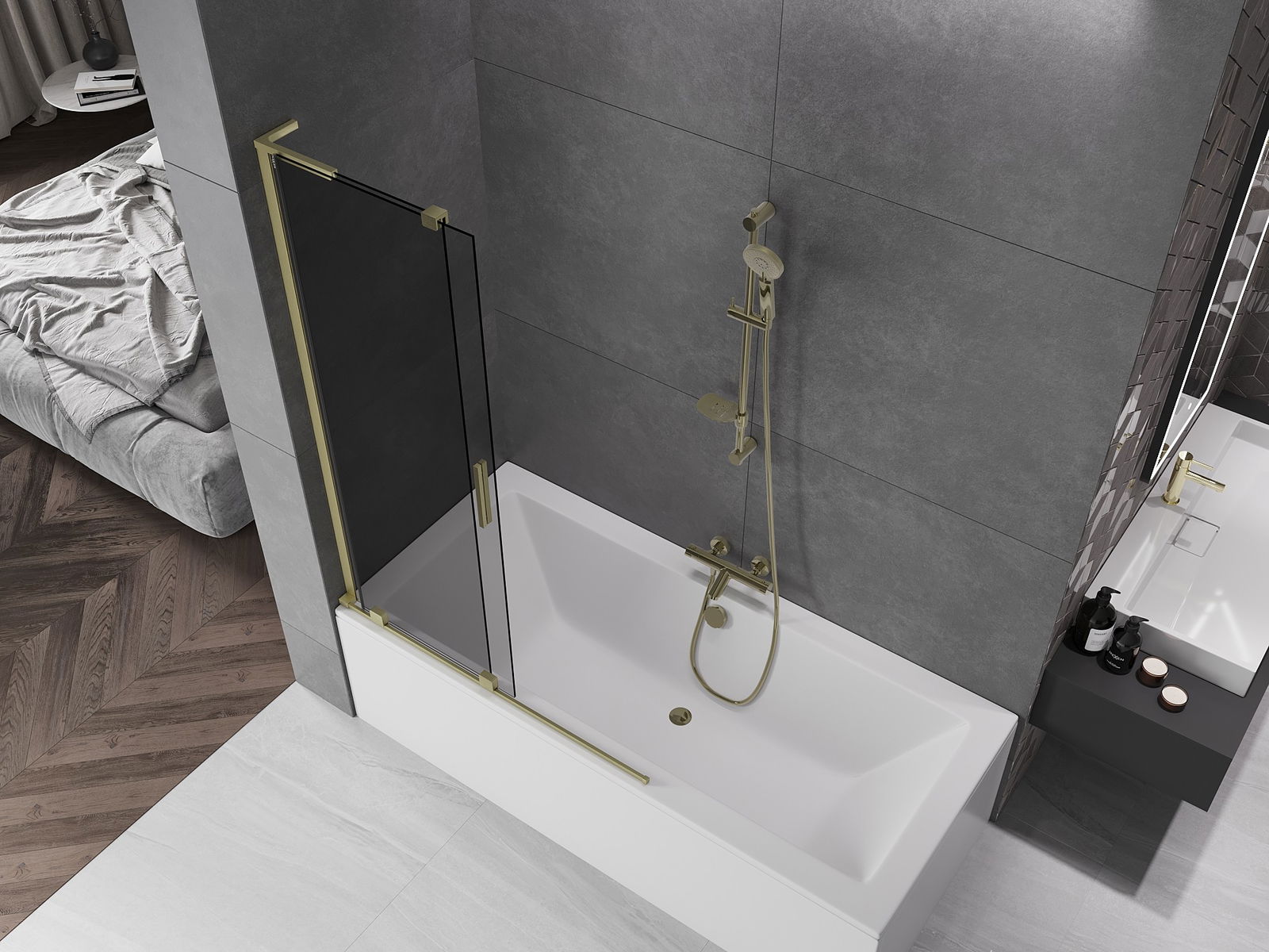 Mexen Velar L fürdőszobai paraván 2-szárnyú toló 110 x 150 cm, grafit, arany kefézett - 896-110-003-41-55