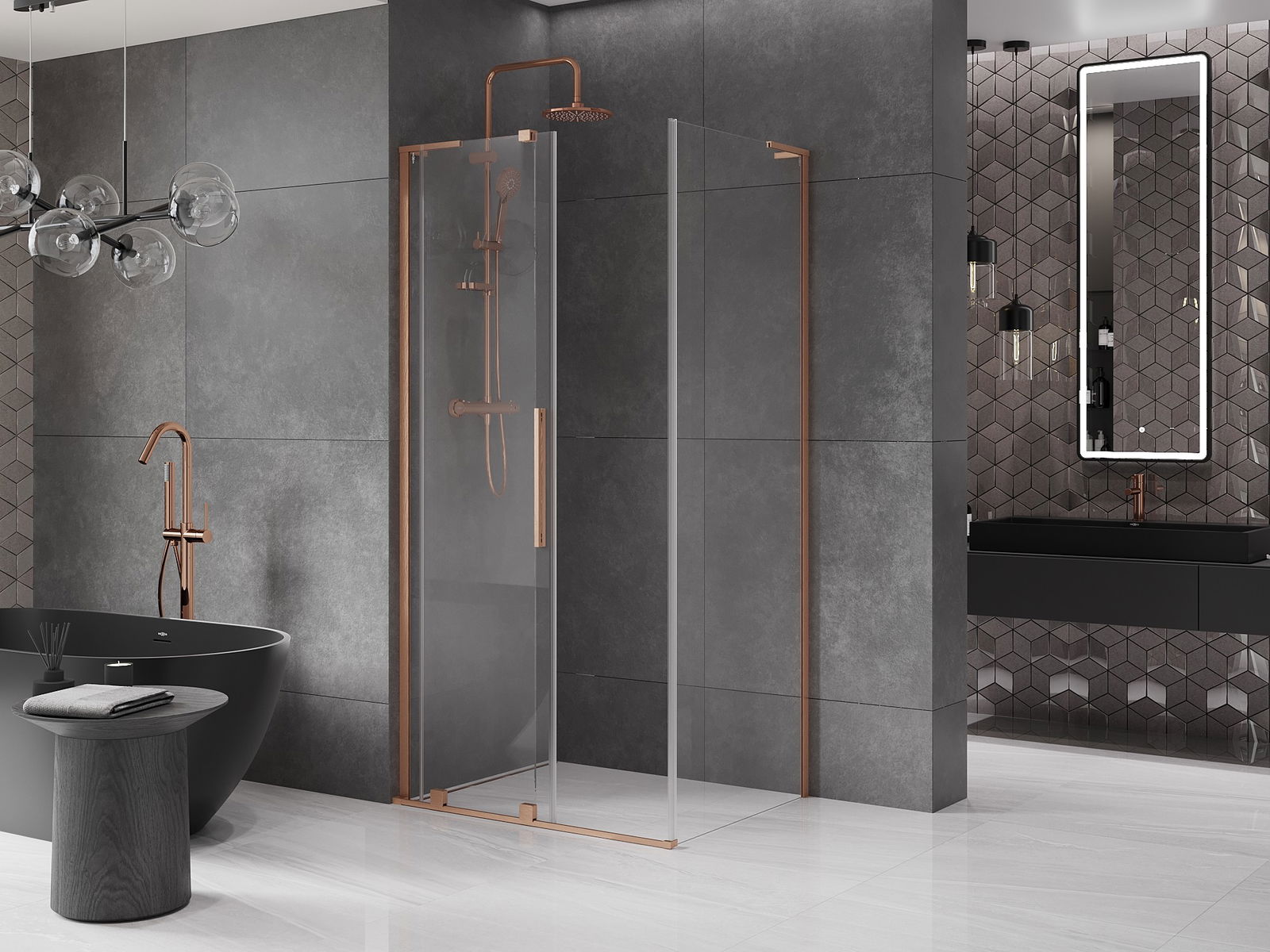 A praktikus és kényelmes fogantyú rozsdamentes acélból készült. A divatos forma a profilok színéhez igazított kivitelezéssel modern és stílusos megjelenést kölcsönöz az egésznek, kiemelve minden fürdőszoba esztétikáját.