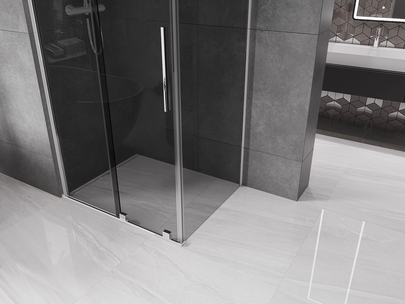 A praktikus és kényelmes fogantyú rozsdamentes acélból készült. A divatos forma a profilok színéhez igazított kivitelezéssel modern és stílusos megjelenést kölcsönöz az egésznek, kiemelve minden fürdőszoba esztétikáját.