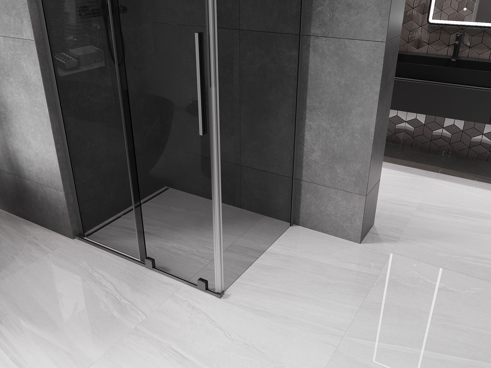 A praktikus és kényelmes fogantyú rozsdamentes acélból készült. A divatos forma a profilok színéhez igazított kivitelezéssel modern és stílusos megjelenést kölcsönöz az egésznek, kiemelve minden fürdőszoba esztétikáját.