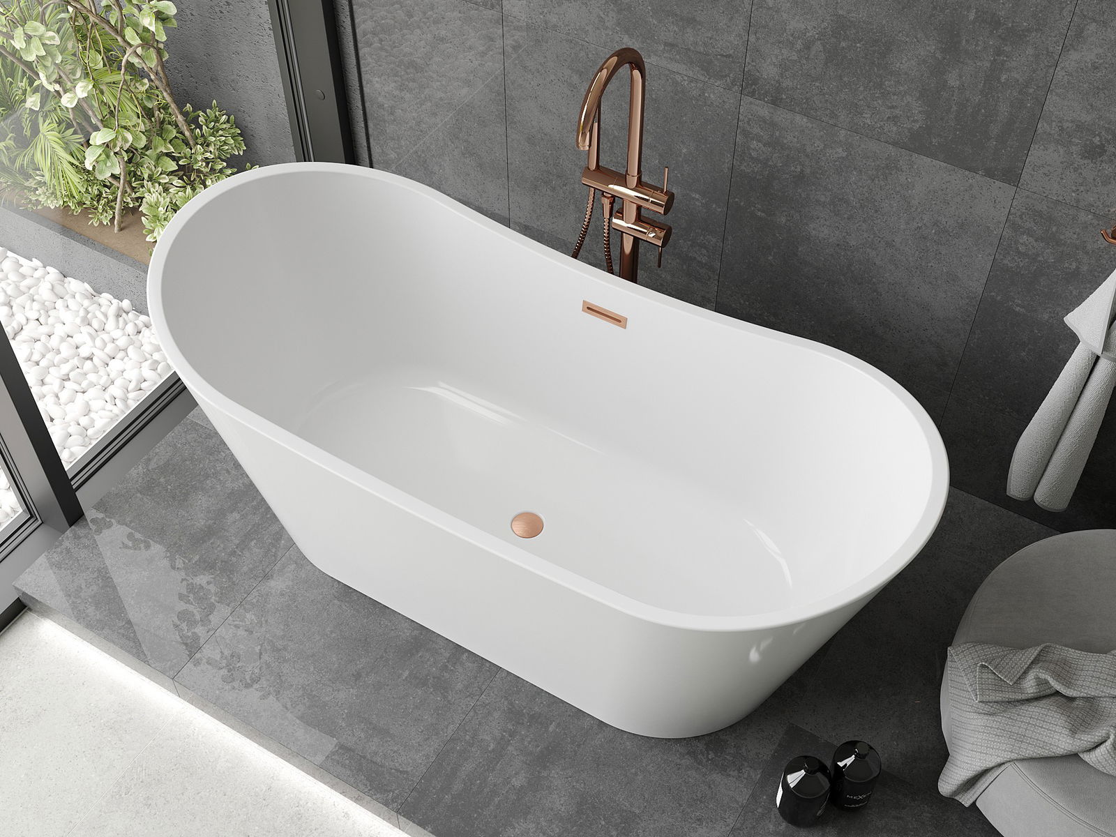 A szabadon álló kád ideális megoldás minden modern fürdőszobához. Méretei 170 x 80 cm, magassága 72 cm, biztosítja a kényelmes használatot. Szaniter akrilból készült, ellenáll a mattulásnak és az UV-sugárzásnak, ami tartós ragyogást garantál. Ovális formája és hófehér színe tökéletesen illeszkedik a modern belső terek esztétikájához. Ezenkívül a kefélt réz díszítőelemek kiemelik elegáns megjelenését. A csomag tartalmazza a szifont és a klikk-klakk leeresztő dugót.
