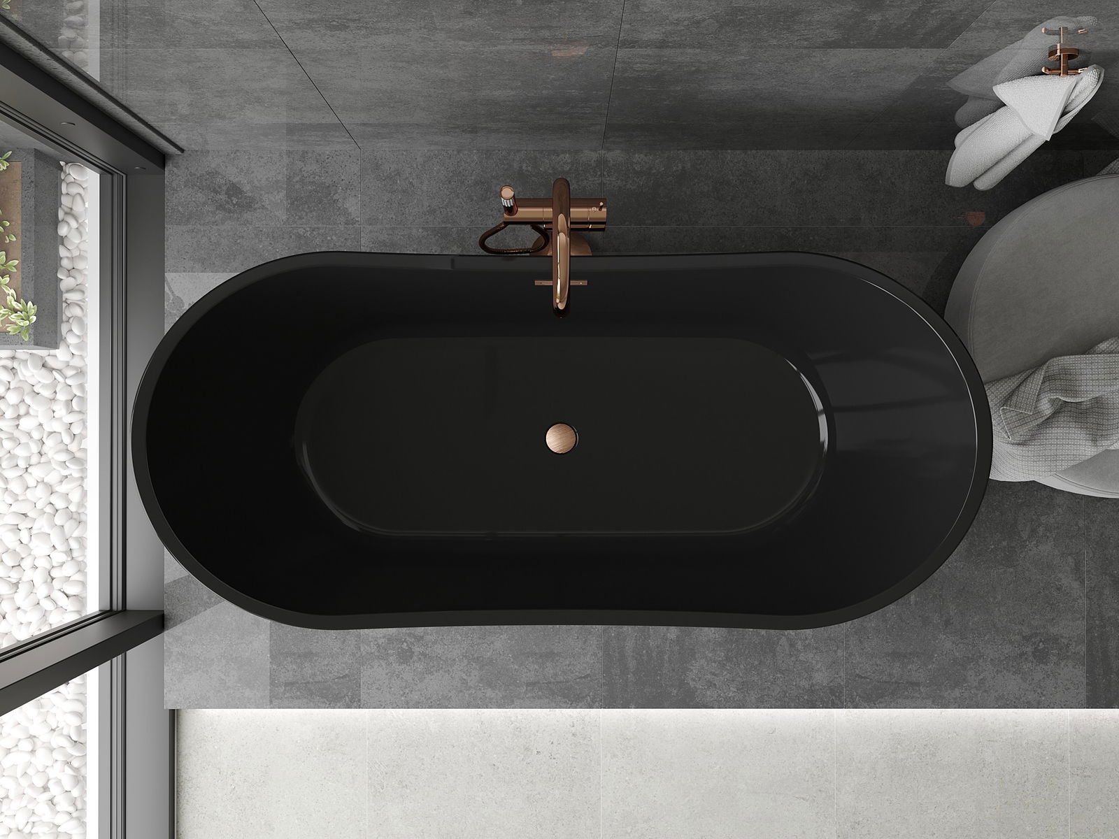 Fekete szabadon álló kád, 170 x 80 cm-es méretekkel, amely ötvözi az eleganciát és a funkcionalitást. Szaniter akrilból készült, ellenáll a mattulásnak és az UV sugárzásnak. Ovális alakja és magas minőségű kivitelezése a szálcsiszolt réz színben stílust kölcsönöz neki. A kád magassága 72 cm, mélysége 44,5 cm, ami kényelmet biztosít fürdés közben. A készlethez tartozik egy túlfolyónyílás és egy szifon is, amelyek további előnyei révén ideális választássá teszik bármely fürdőszobába.