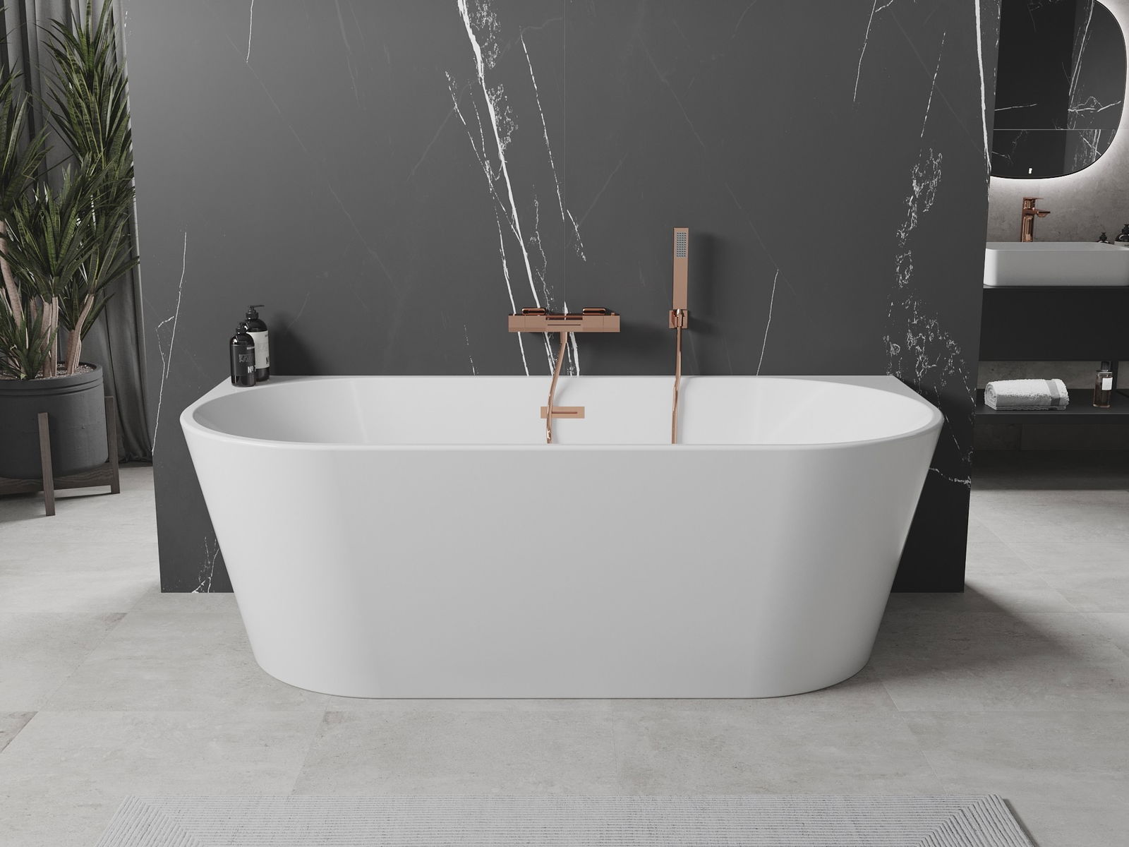 Az ovális szabadon álló kád 170 x 80 cm-es méretekkel az elegancia és funkcionalitás tökéletes kombinációja. Tartós szaniter akrilból készült, fehér színben, amely ellenáll a mattulásnak és az UV-sugárzásnak. Rózsaarany befejezése különleges jelleget kölcsönöz neki. A kád fal melletti és túlfolyóval rendelkezik, ami növeli a használati kényelmet. A szifon és a klikk-klakk dugó a készlet részét képezi, ami egyszerű és gyors szerelést tesz lehetővé.