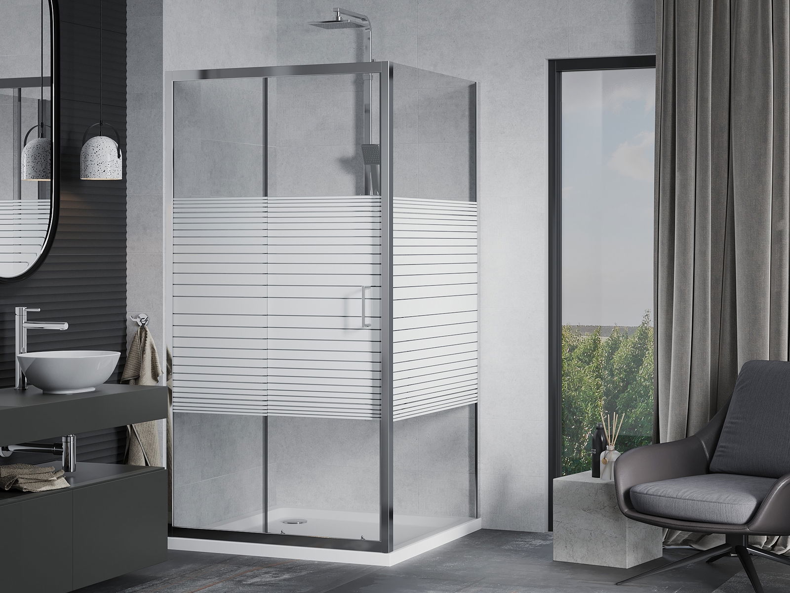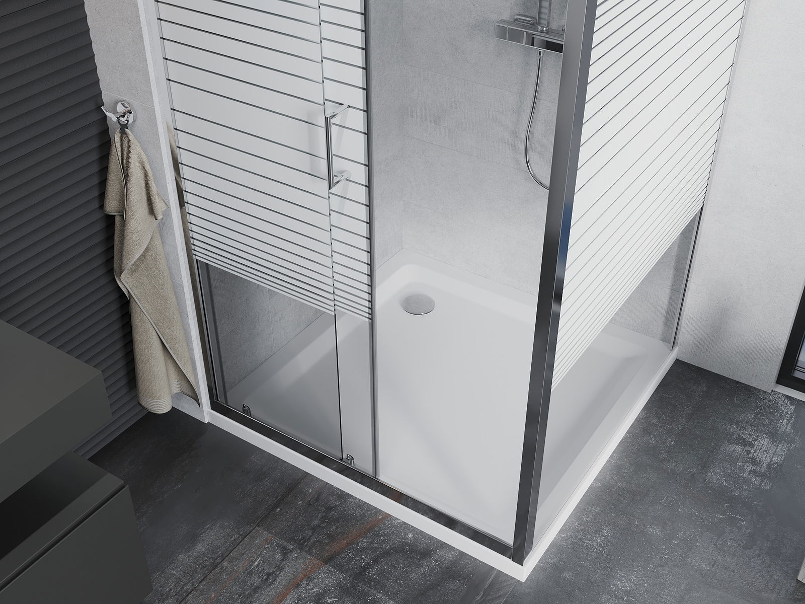 A praktikus és kényelmes fogantyú tartós és ellenálló fémből készült. A divatos forma a profilok színéhez igazított kivitelezéssel együtt modern és stílusos megjelenést kölcsönöz az egésznek, kiemelve minden fürdőszoba esztétikáját.