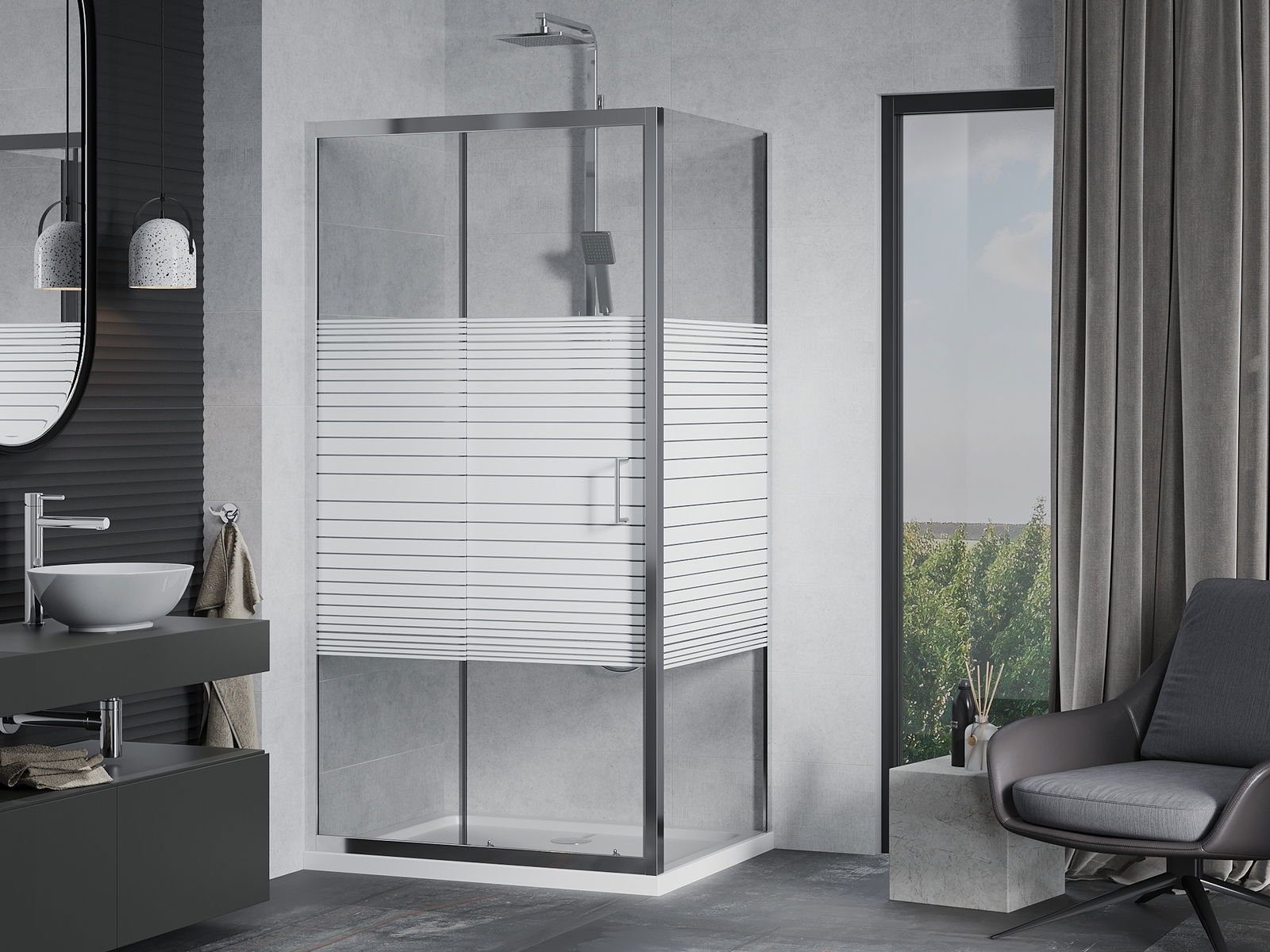 Mexen Apia tolóajtós zuhanykabin 140 x 70 cm, fehér csíkok, króm + Flat zuhanytálca - 840-140-070-01-20-4010