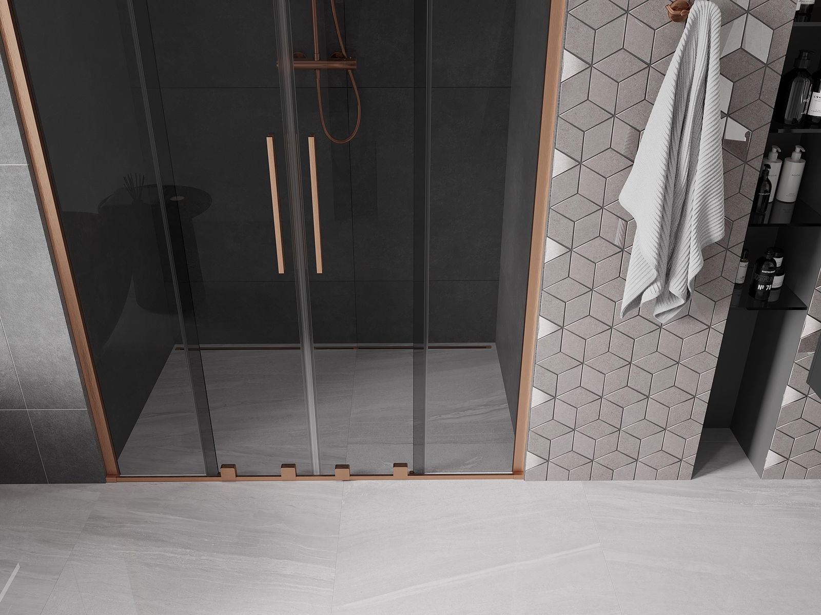 A praktikus és kényelmes fogantyú rozsdamentes acélból készült. A divatos forma a profilok színéhez igazított kivitelezéssel modern és stílusos megjelenést kölcsönöz az egésznek, kiemelve minden fürdőszoba esztétikáját.