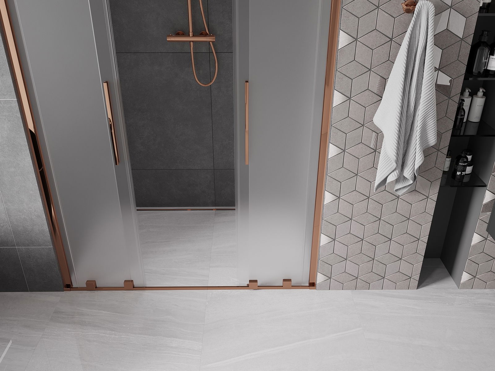 A praktikus és kényelmes fogantyú rozsdamentes acélból készült. A divatos forma a profilok színéhez igazított kivitelezéssel modern és stílusos megjelenést kölcsönöz az egésznek, kiemelve minden fürdőszoba esztétikáját.