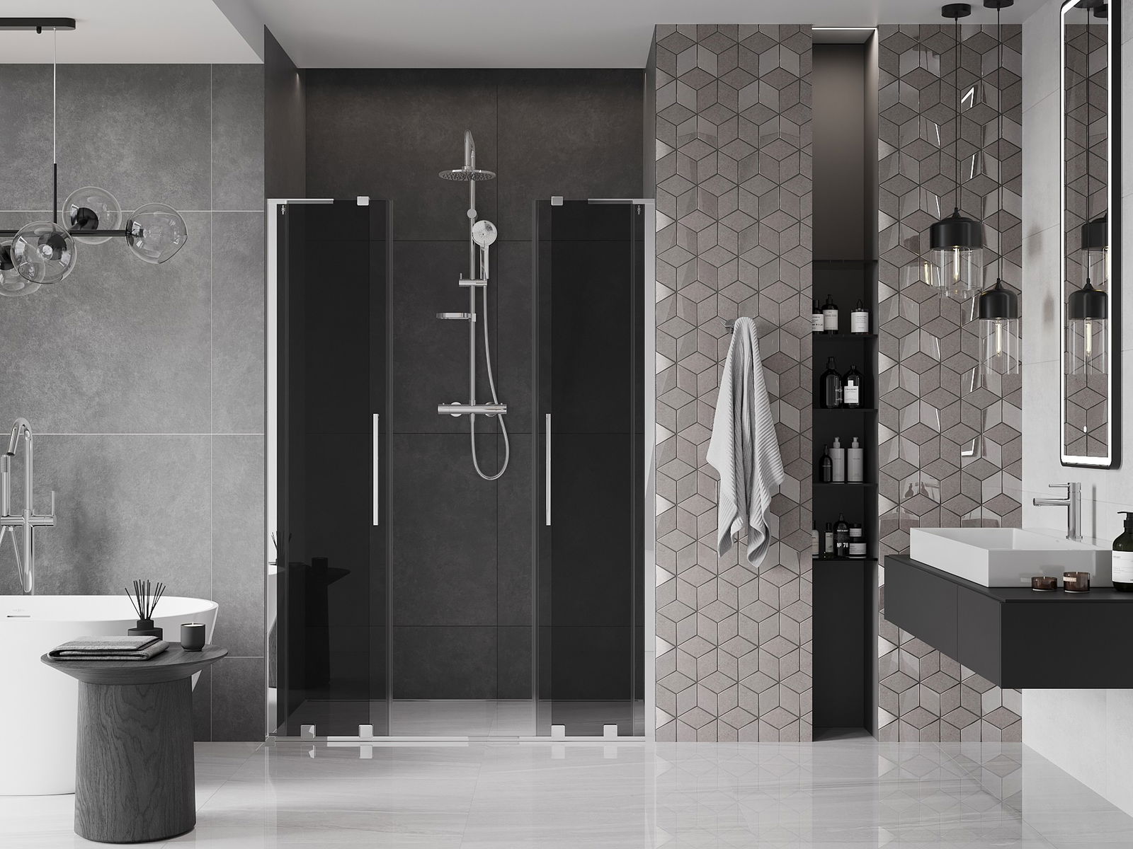 A praktikus és kényelmes fogantyú rozsdamentes acélból készült. A divatos forma a profilok színéhez igazított kivitelezéssel modern és stílusos megjelenést kölcsönöz az egésznek, kiemelve minden fürdőszoba esztétikáját.