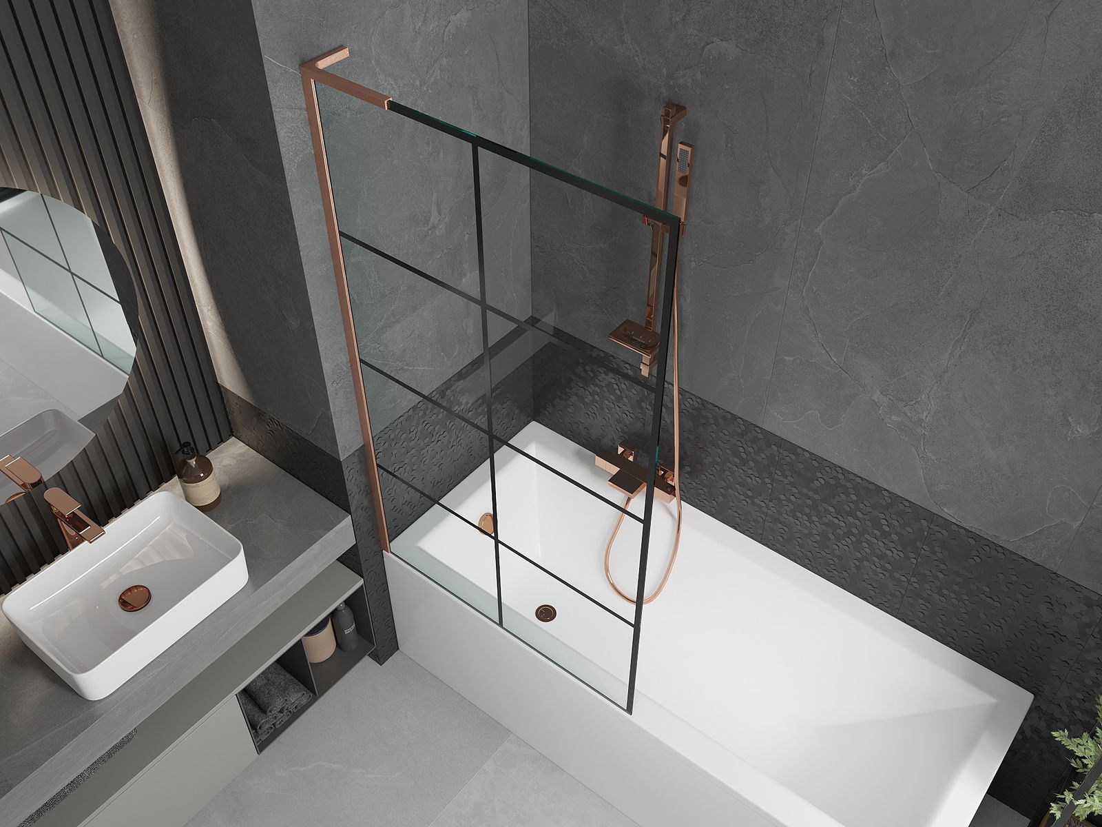 Mexen Next L fürdőkád paraván 1-szárnyas 90 x 150 cm, fekete rács, kefélt réz - 895-090-000-03-77-65