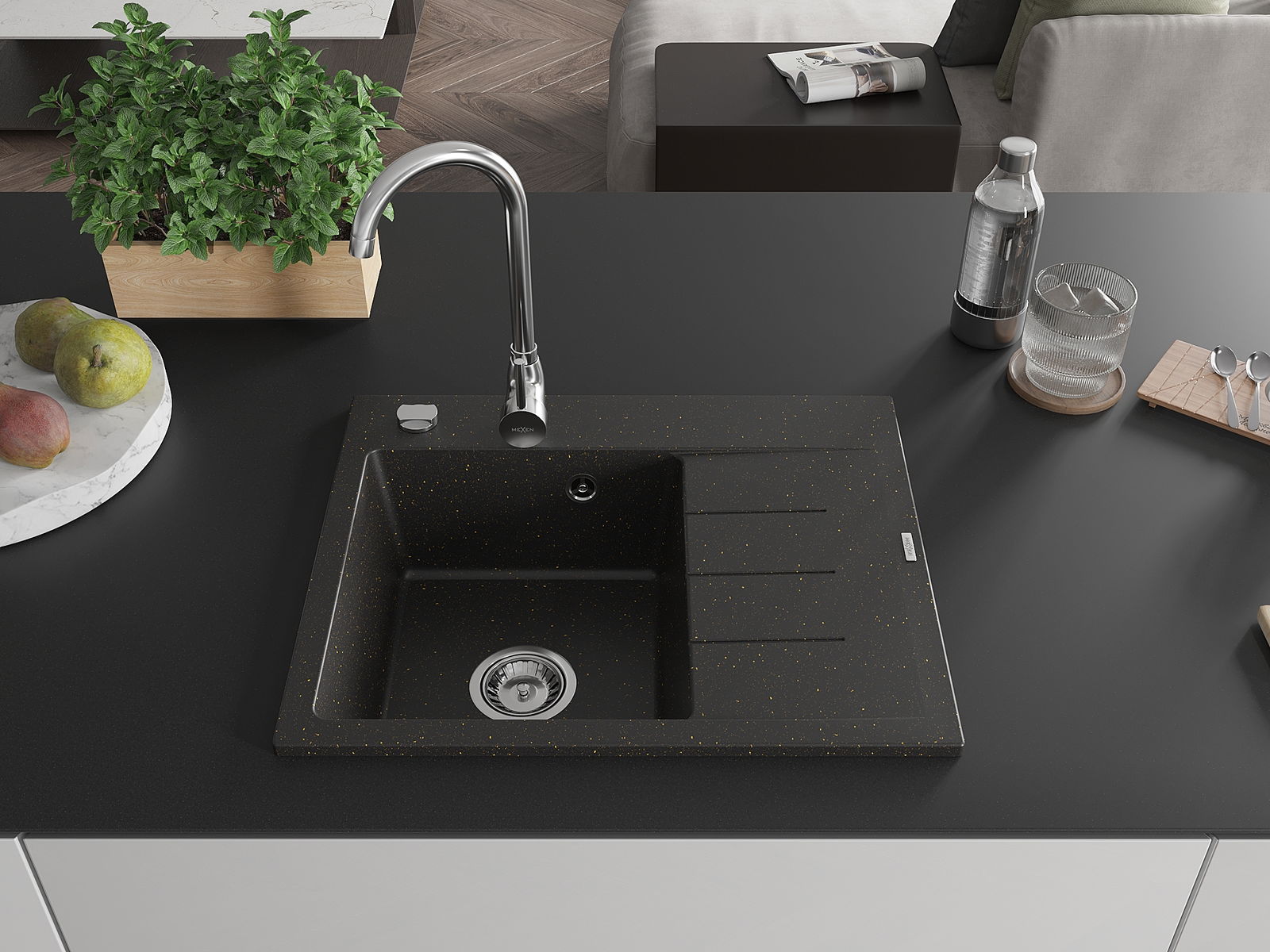 Mexen Ben 1 rekeszes gránit mosogató csepegtetővel, balos, 600 x 500 mm, fekete/arany metál, krómozott szifon