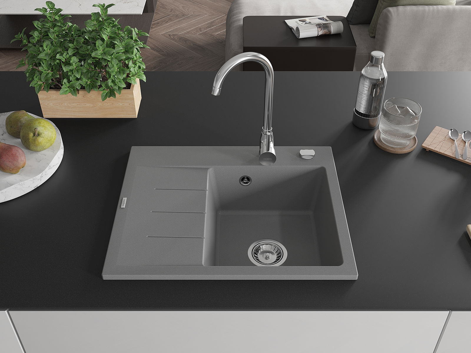 A mosogató magas minőségű gránitból készült. Elegáns, de mindenekelőtt praktikus kiegészítője minden konyhának, függetlenül annak stílusától. A gránit magas minősége és tartóssága hosszú távú használatot biztosít.