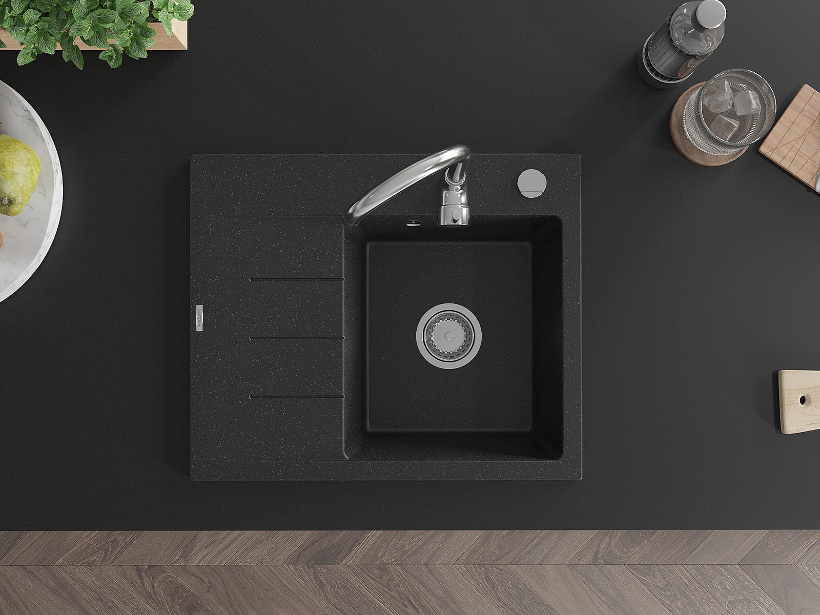Mexen Ben gránit mosogatómedence 1 rekeszes csepegtetővel, jobb oldali, 600 x 500 mm, fekete/ezüst metál, króm szifon