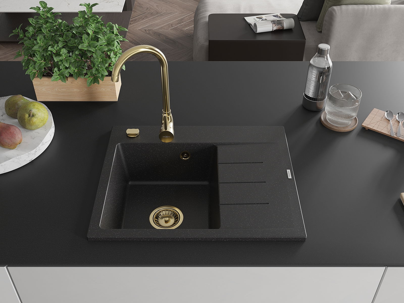 Mexen Ben gránit mosogató 1-medencés csepegtetővel, balos 600 x 500 mm, fekete/ezüst metál szifon arany - 6522605000-73-G
