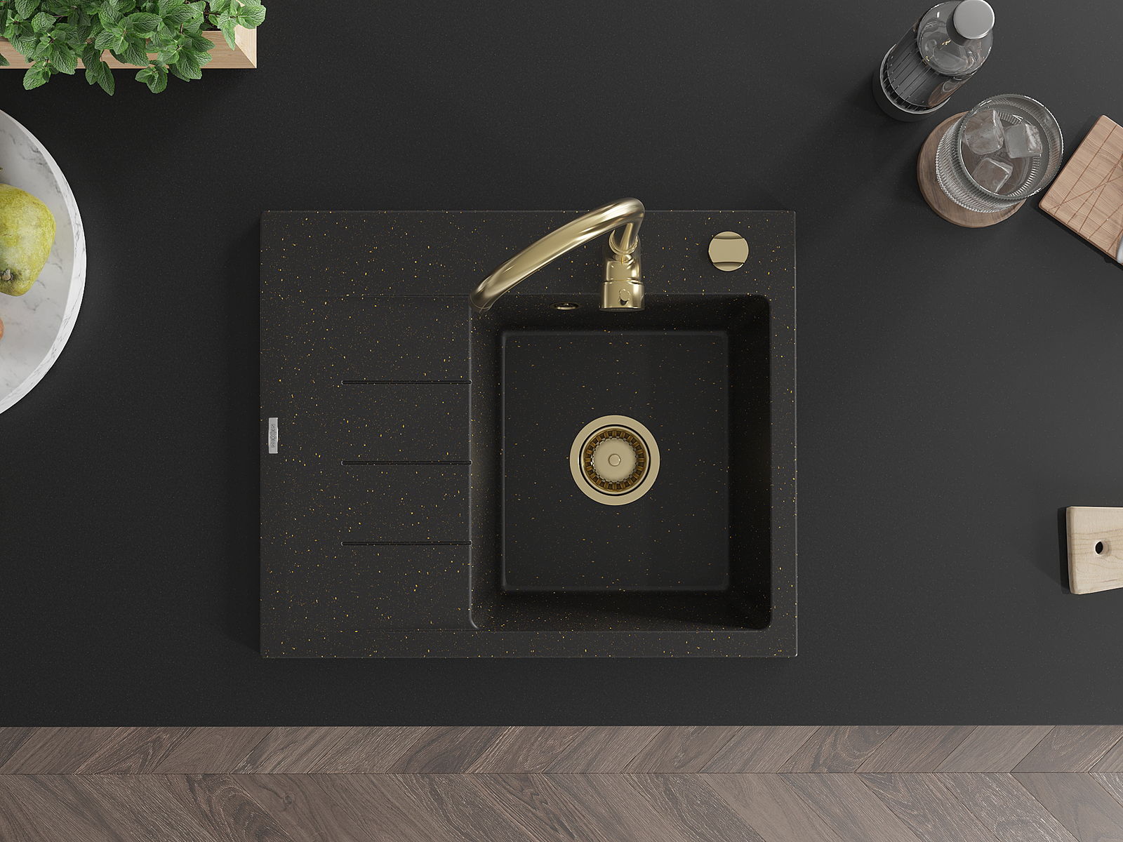 Mexen Ben gránit egykamrás mosogató csepegtetővel, jobb oldali 600 x 500 mm, fekete/arany metál, arany szifon