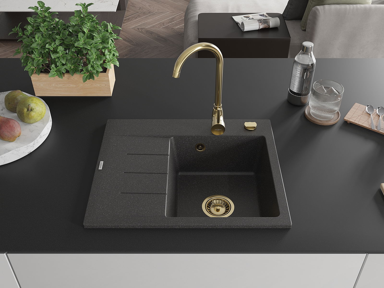 Mexen Ben Gránit egytálcás mosogató csepegtetővel, jobb oldali, 600 x 500 mm, fekete pöttyös, arany szifon