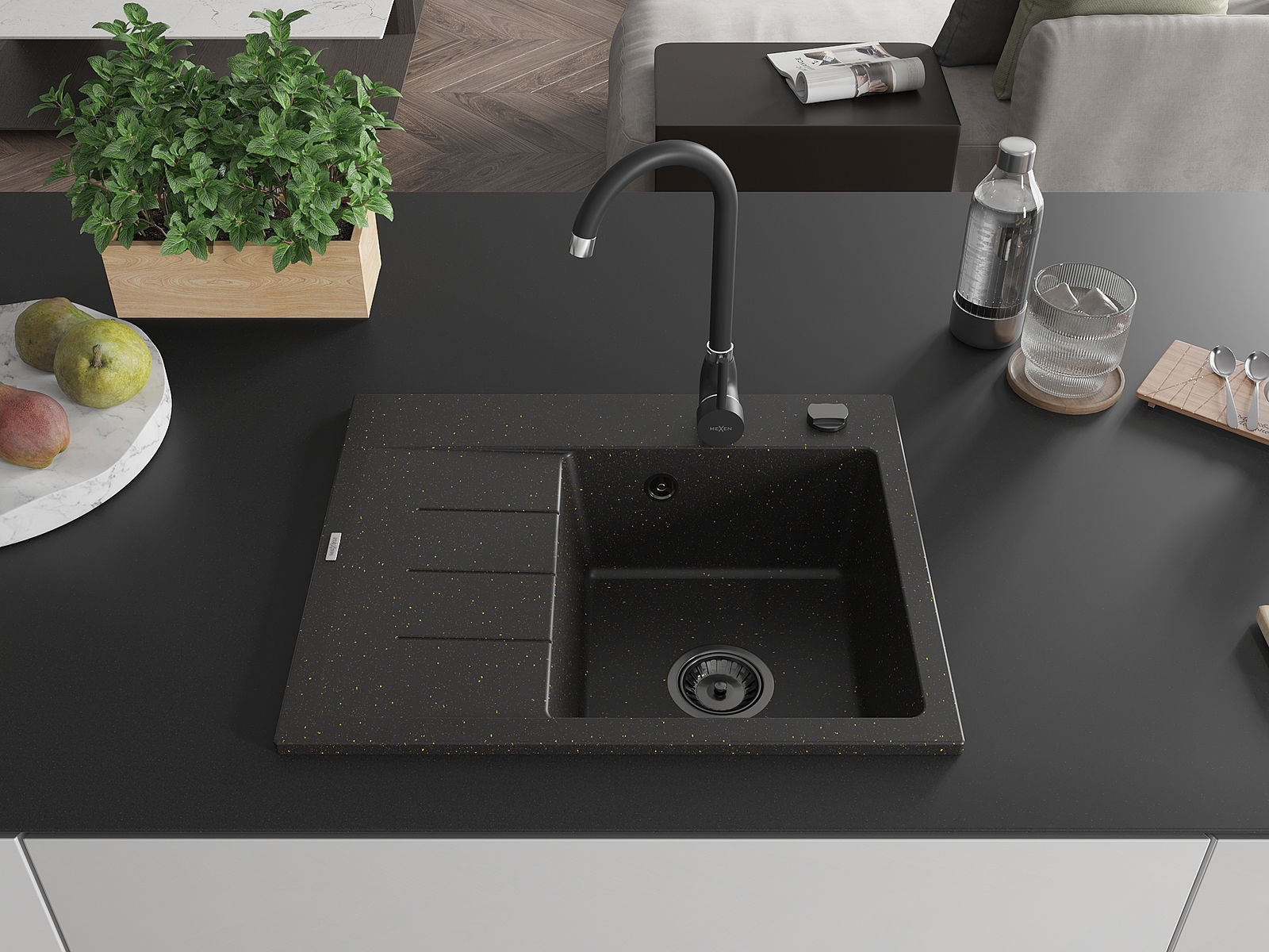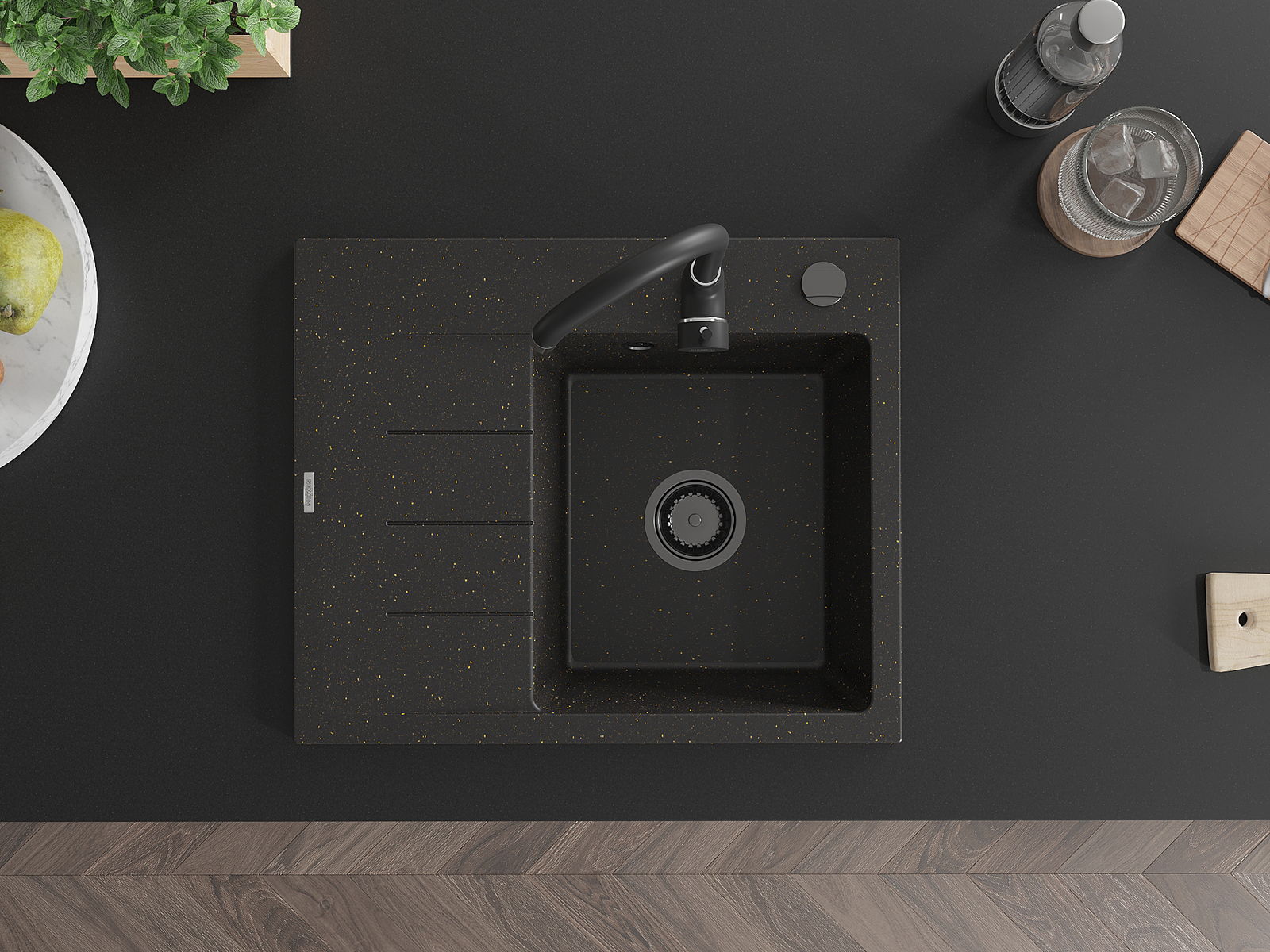 Mexen Ben gránit mosogató 1-medencés csepegtetővel, jobb oldali, 600 x 500 mm, fekete/arany metál fekete szifon