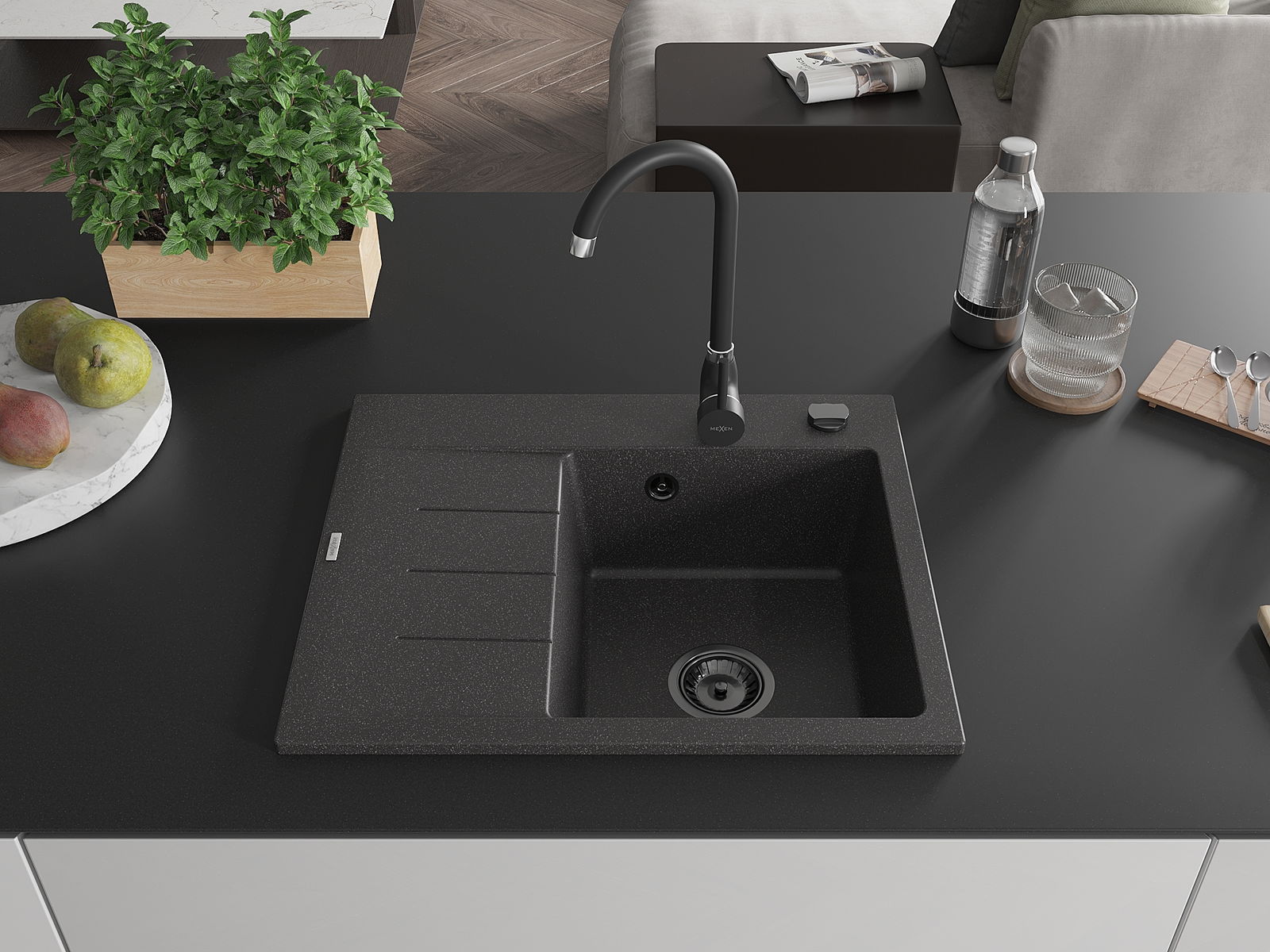 Mexen Ben gránit mosogató 1 medencés csepegtetővel, jobb oldali, 600 x 500 mm, fekete pöttyös, fekete szifonnal