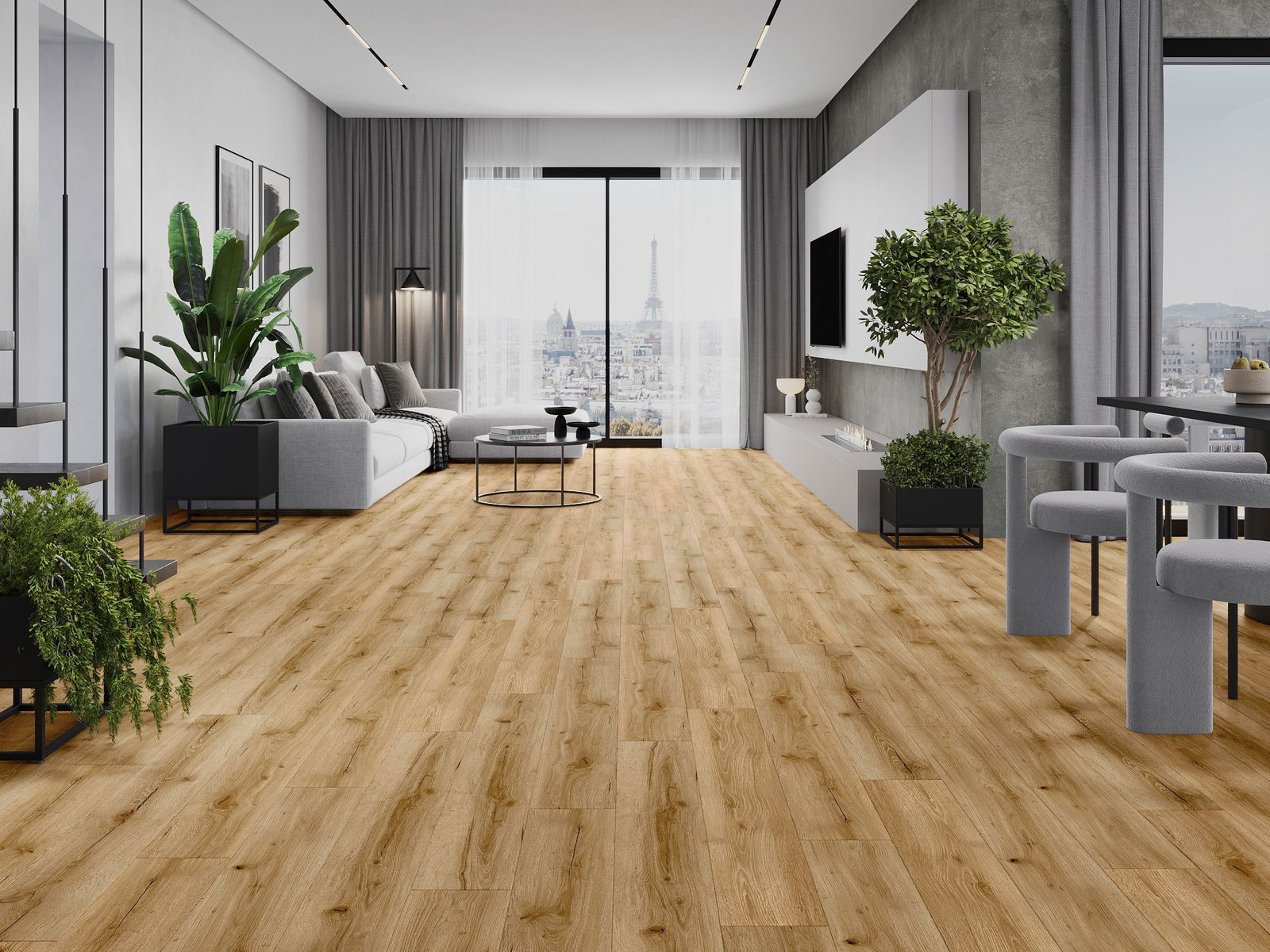 A 1240 x 182 mm-es formátumú vinyl panel kiváló választás minden belső tér számára. 6,5 mm-es vastagsága, 0,55 mm-es kopásálló rétege nemcsak kivételes tartósságot, hanem kényelmet is biztosít használat közben. Vízállósága és mechanikai sérülésekkel szembeni ellenállása hosszú távú elégedettséget garantál. Az egyszerű telepítést az Uniclick 2G rendszer és az integrált IXPE réteg gyorssá és problémamentessé teszi. Ezen kívül, a vonzó dizájn a 4-oldali V-fuga eleganciát kölcsönöz minden helyiségnek.