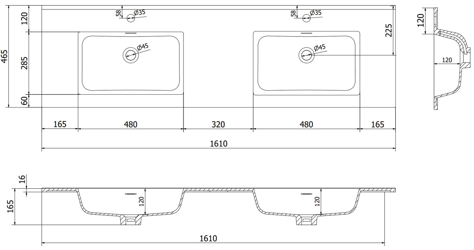 Mexen Otis munkalapba süllyesztett dupla mosdó 161 x 46,5 cm, fényes fehér - 25181600D