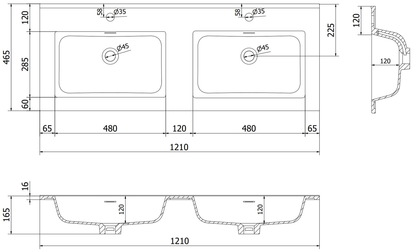 Mexen Otis munkalapba süllyesztett dupla mosdó 121 x 46,5 cm, fekete matt - 25181271D