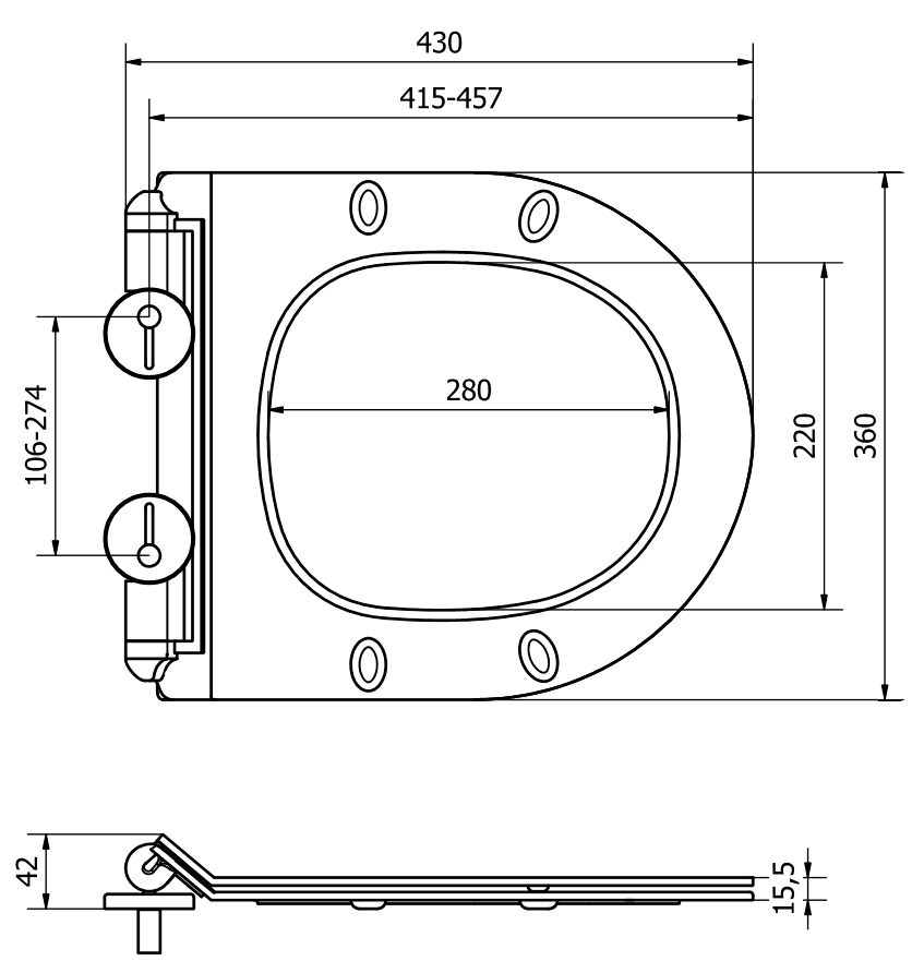 A készlet tartalmaz szilárd fém zsanérokat, amelyek garantálják a deszka stabil rögzítését a WC -tálba. Ez egy gyakorlati megoldás, amely lehetővé teszi a tábla egyszerű beállítását a WC alakjához és méretéhez, biztosítva a használat kényelmét.