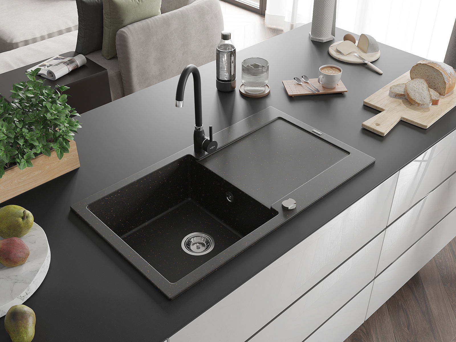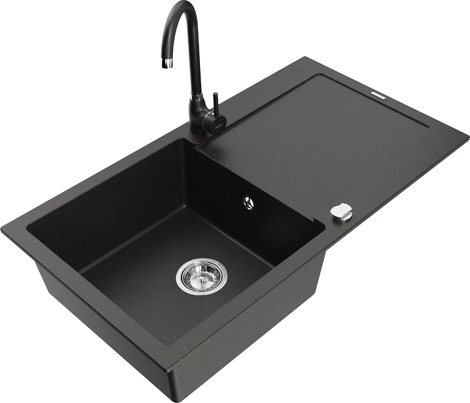 Mexen Leo gránit mosogató, 1 medencés, csepegtetővel és Telma konyhai csapteleppel, fekete/arany metál - 6501-75-670200-70