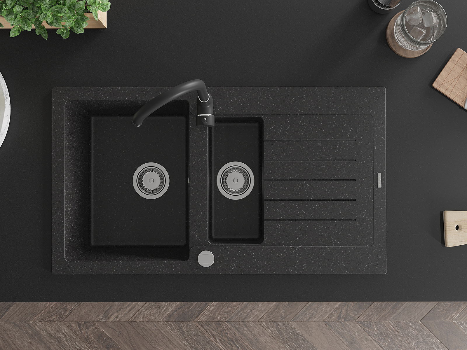 A mosogató kiváló minőségű gránitból készül. Ez egy elegáns és mindenekelőtt minden konyhához praktikus kiegészítés, stílusától függetlenül. A kiváló minőségű és a gránit tartósság biztosítja a sok éves használatát.