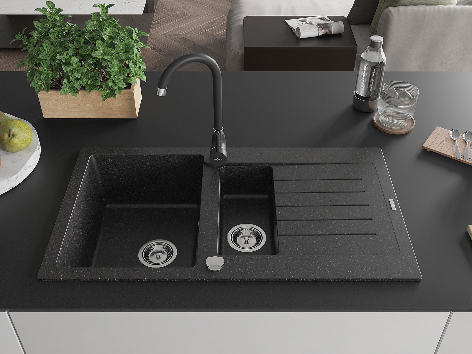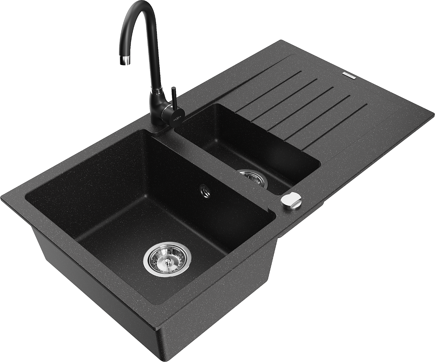 Mexen Matias 1,5 rekeszes gránit mosogató csepegtetővel és Telma konyhai csapteleppel, fekete/ezüst - 6502-73-670200-70
