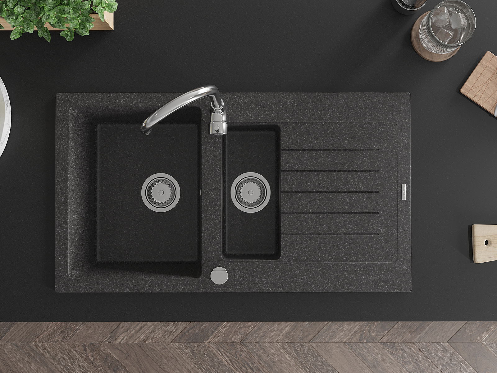 Mexen Matias 1,5 medencés gránit mosogató csepegtetővel és Telma konyhai csapteleppel, fekete pöttyös - 6502-76-670200-00