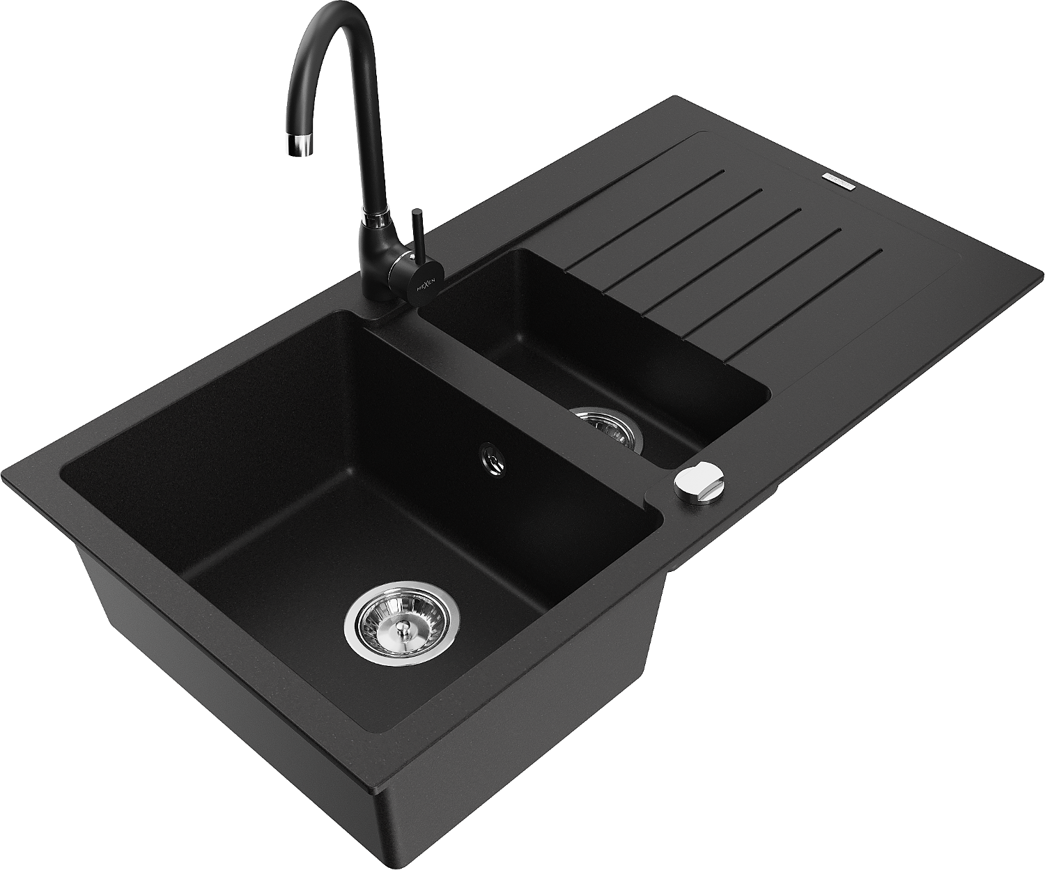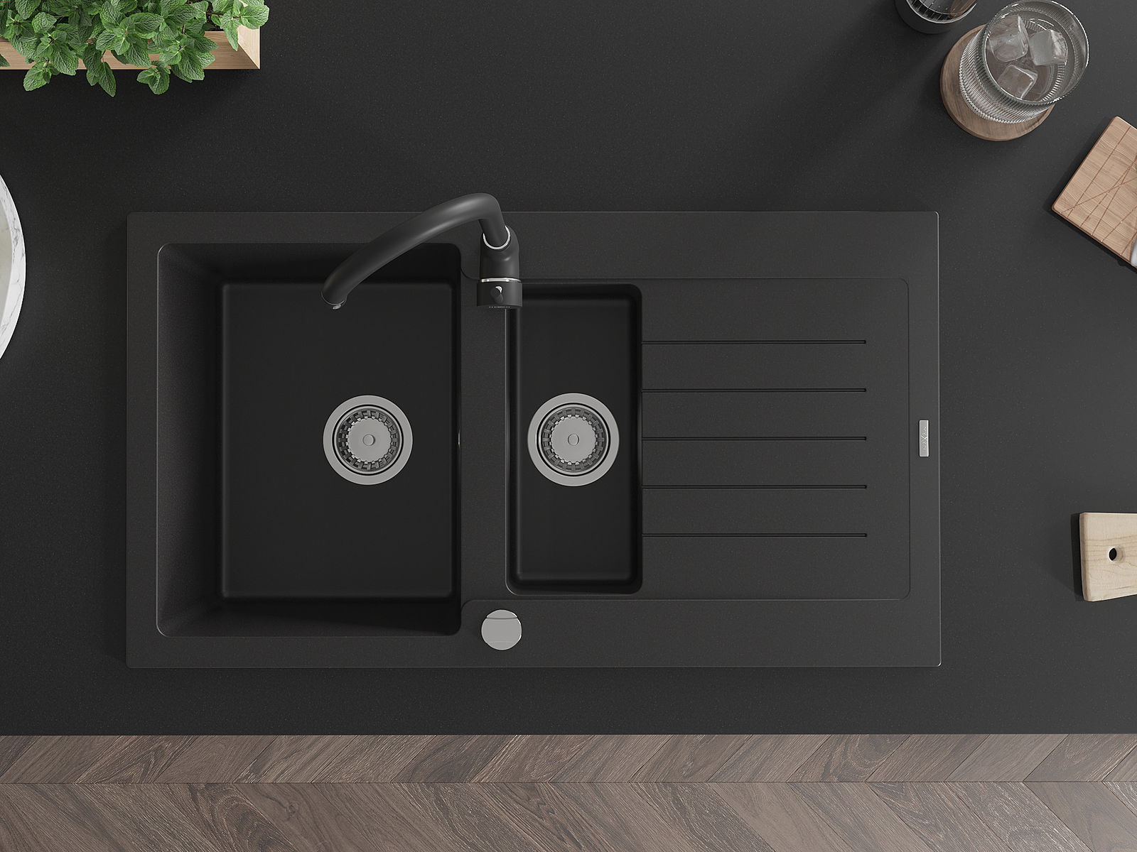 Mexen Matias 1,5-medencés gránit mosogatótálca csepegtetővel és Telma konyhai csapteleppel, fekete - 6502-77-670200-70