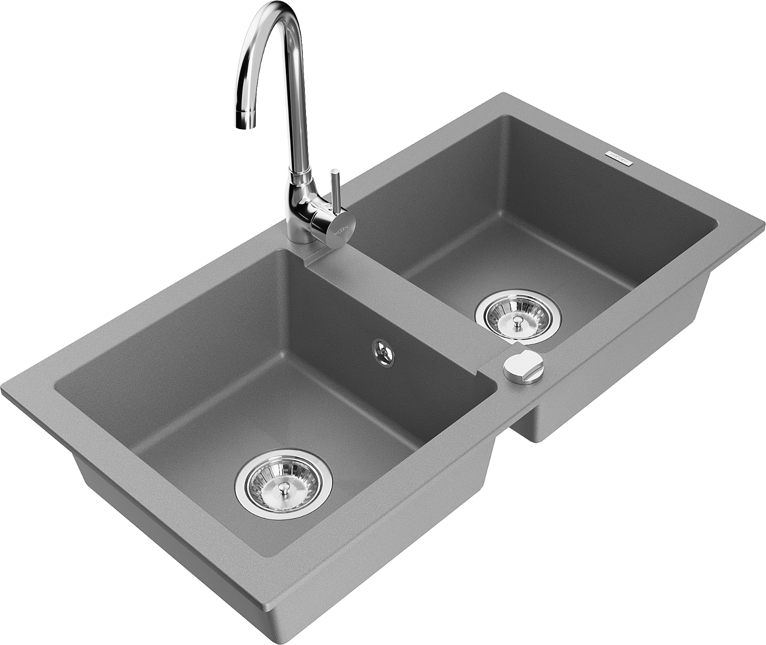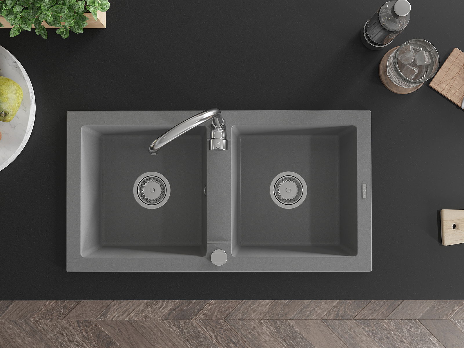Mexen Mario 2 rekeszes gránit mosogató Telma konyhai csappal, szürke - 6504-71-670200-00