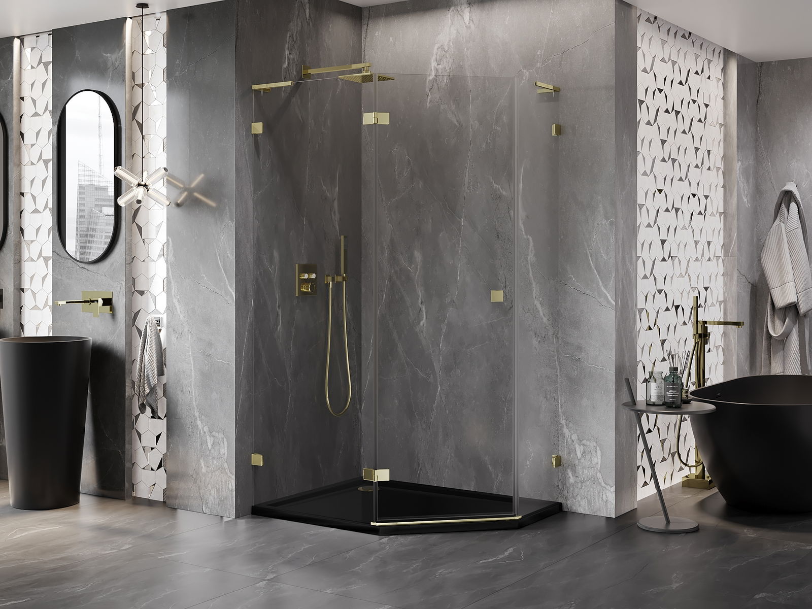 Mexen Lunar L ötszögű, balra nyíló zuhanykabin, 100 x 80 cm, átlátszó, arany - 831L-100L-080P-50-00-L