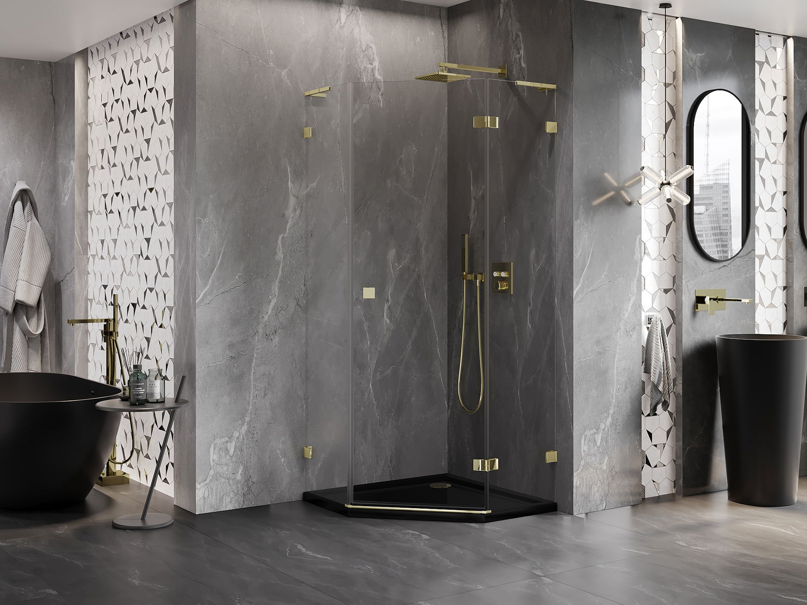 Mexen Lunar L ötszögletű jobbos nyíló zuhanykabin 80 x 80 cm, áttetsző, arany - 831L-080P-080L-50-00-P