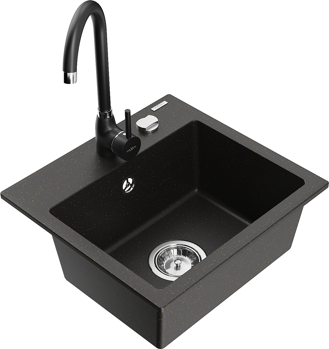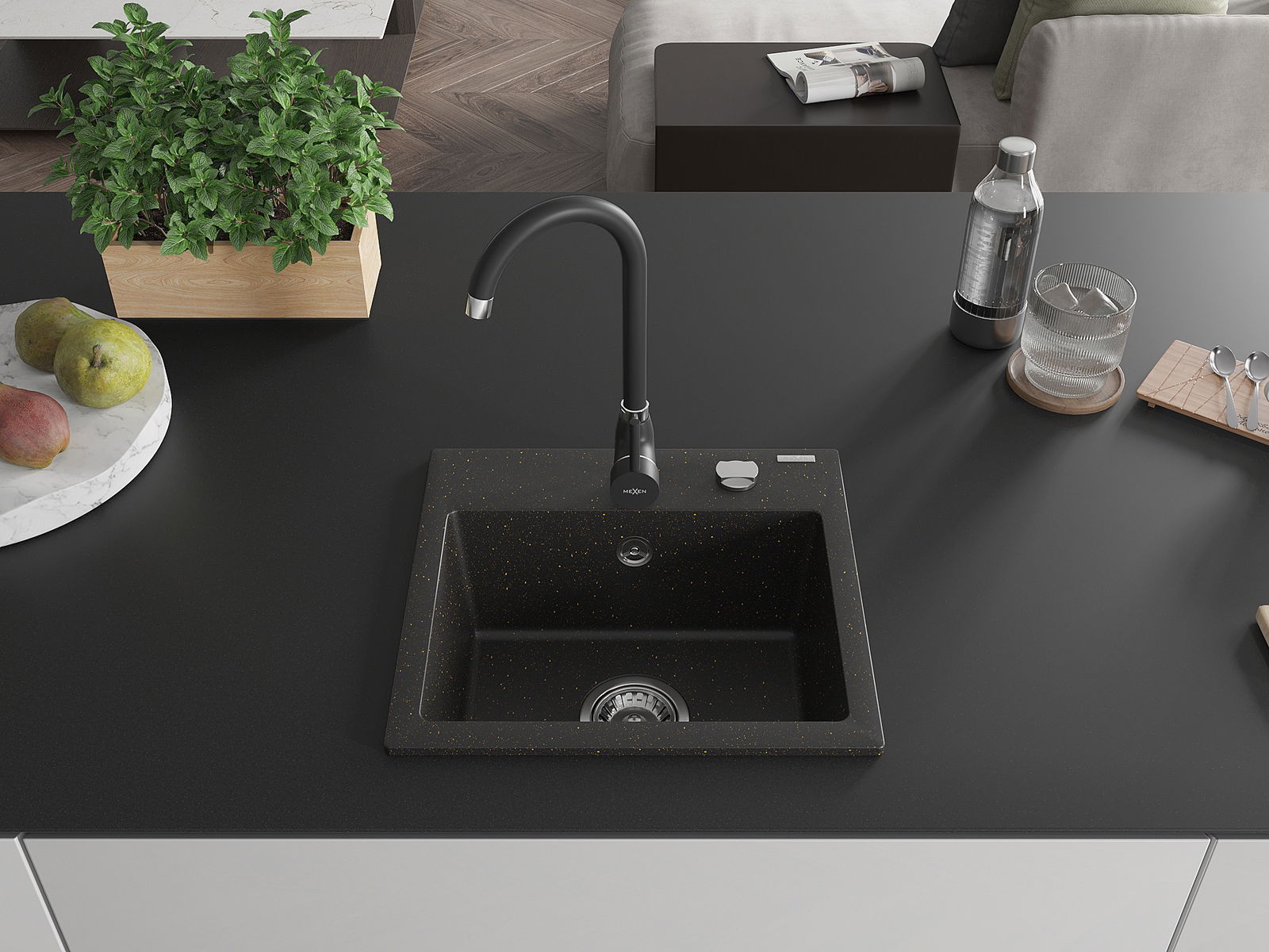 Mexen Milo egymedencés gránit mosogató, Telma konyhai csapteleppel, fekete/arany - 6505-75-670200-70