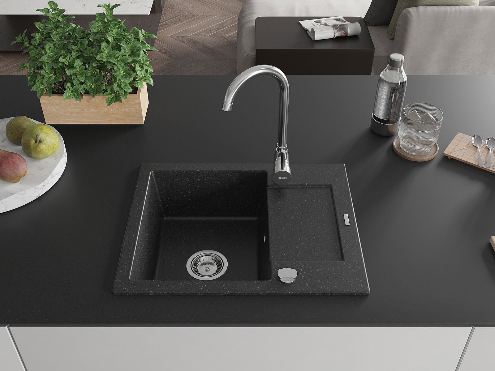 Mexen Enzo egymedencés gránit mosogató csepegtetővel és Telma konyhai csapteleppel, fekete/ezüst - 6506-73-670200-00