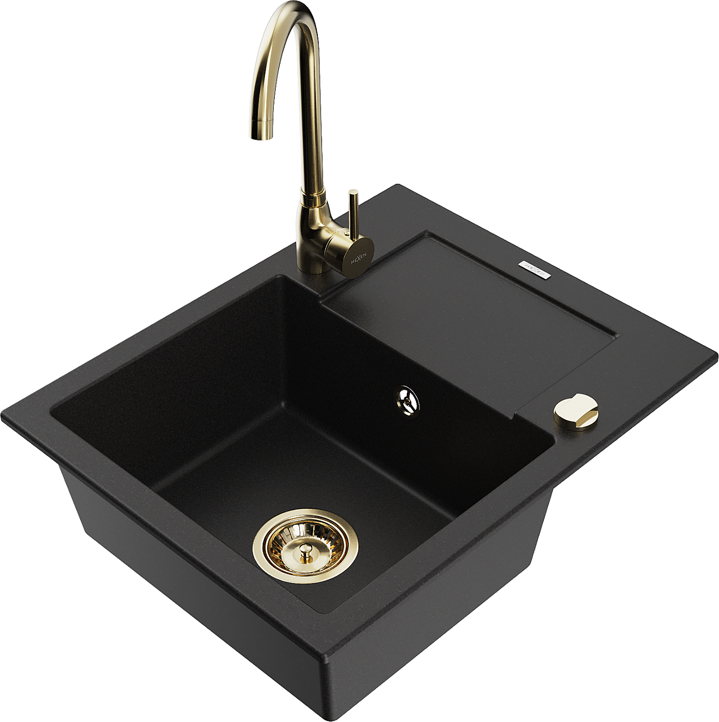 Mexen Enzo 1-medencés gránit mosogató csepegtetővel és Telma konyhai csapteleppel, fekete - 6506-77-670200-50