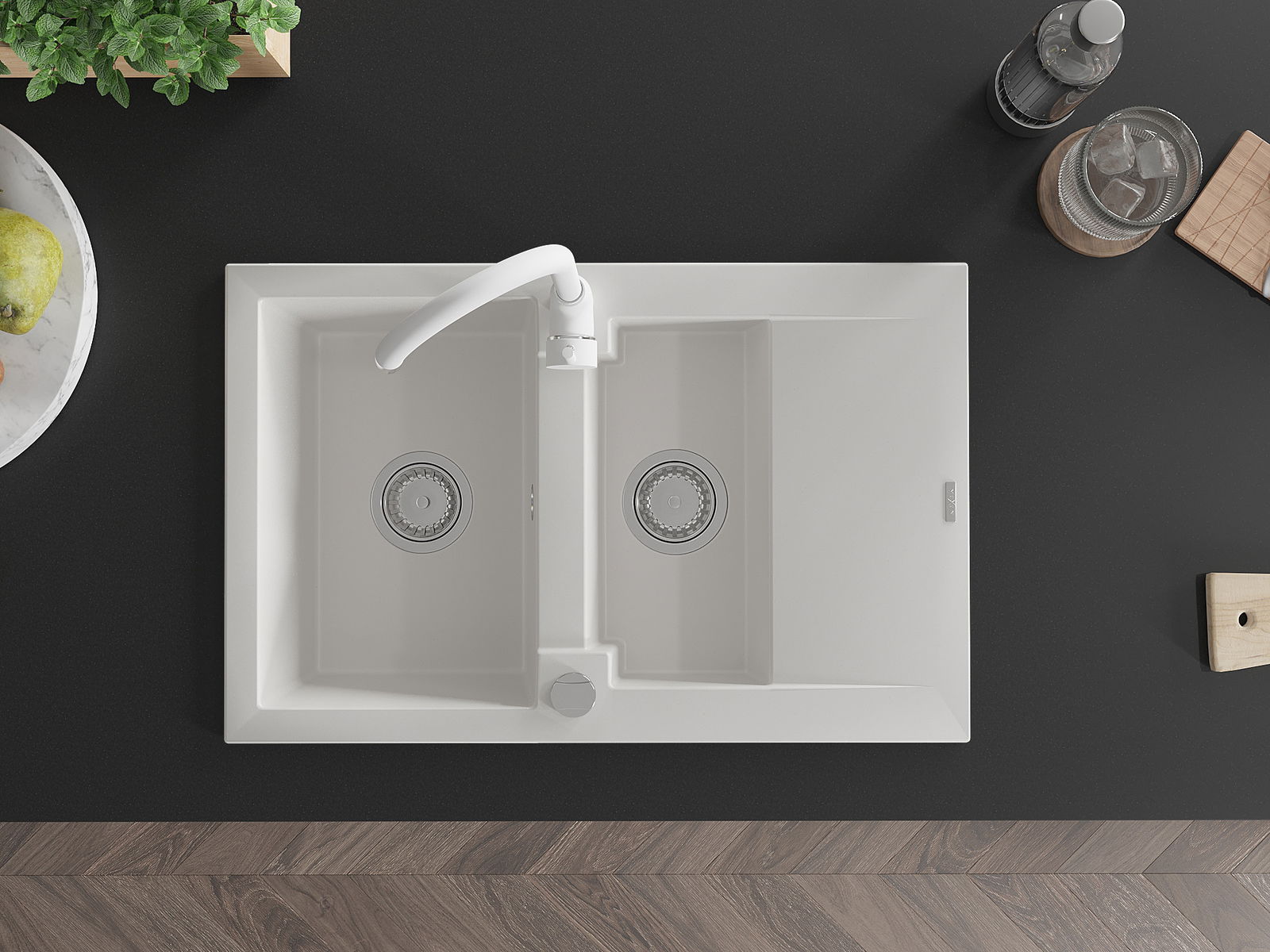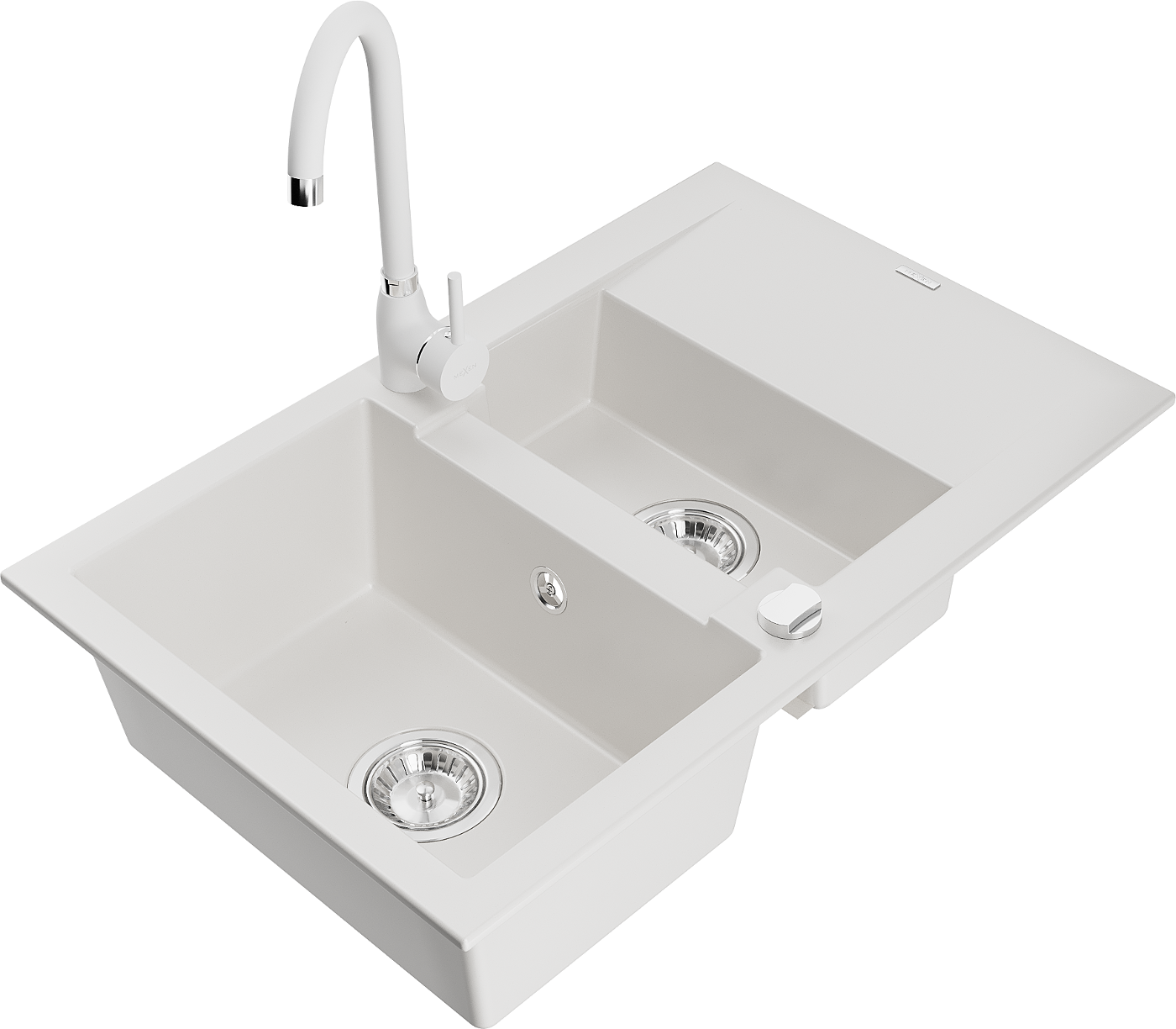 Mexen Gaspar gránit mosogató, 1,5 rekeszes, csepegtetővel és Telma konyhai csapteleppel, fehér - 6507-20-670200-20