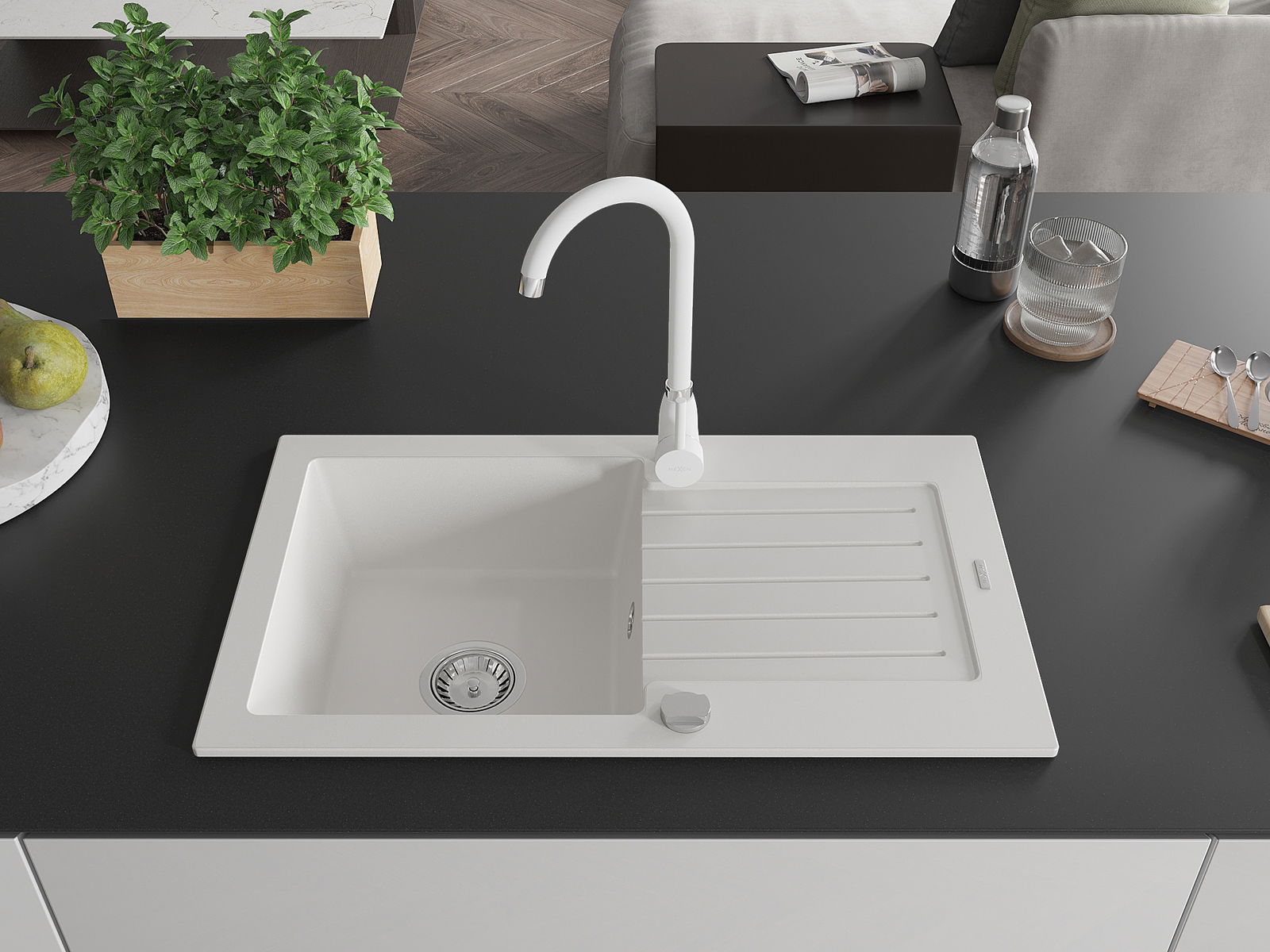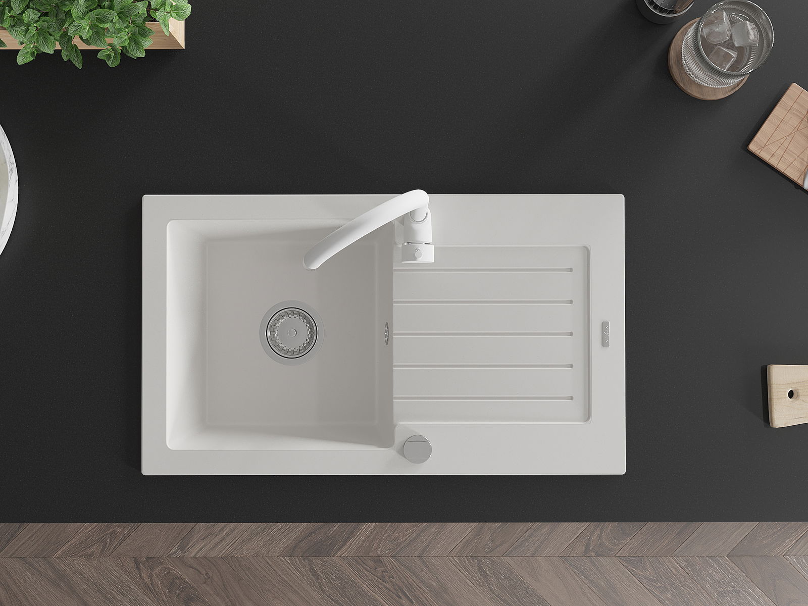 Mexen Pablo gránit mosogató 1-medencés csepptálcával és Telma konyhai csapteleppel, fehér - 6510-20-670200-20