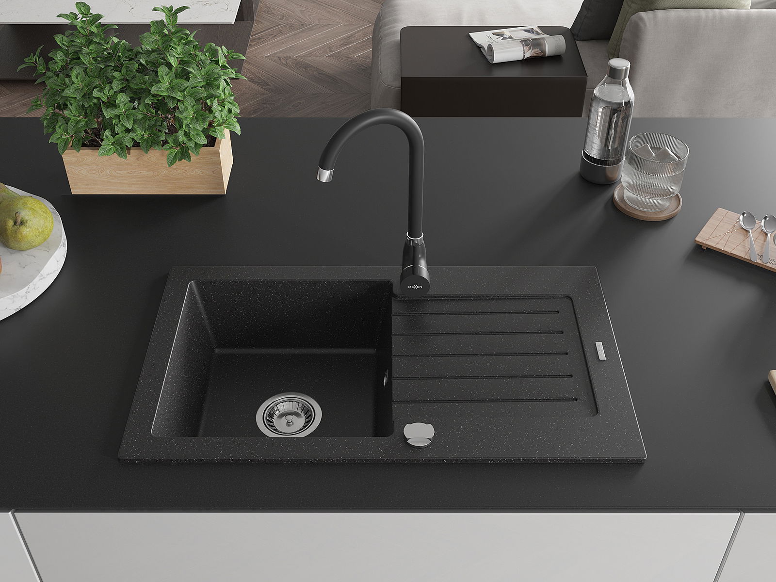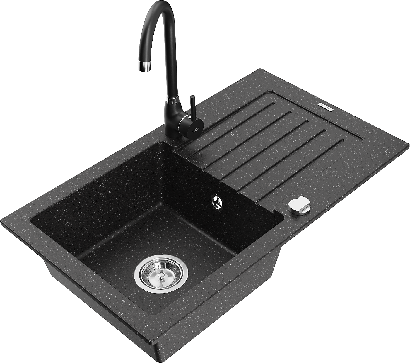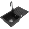 Mexen Pablo egykamrás gránit mosogató csepegtetővel és Telma konyhai csapteleppel, fekete/ezüst - 6510-73-670200-70