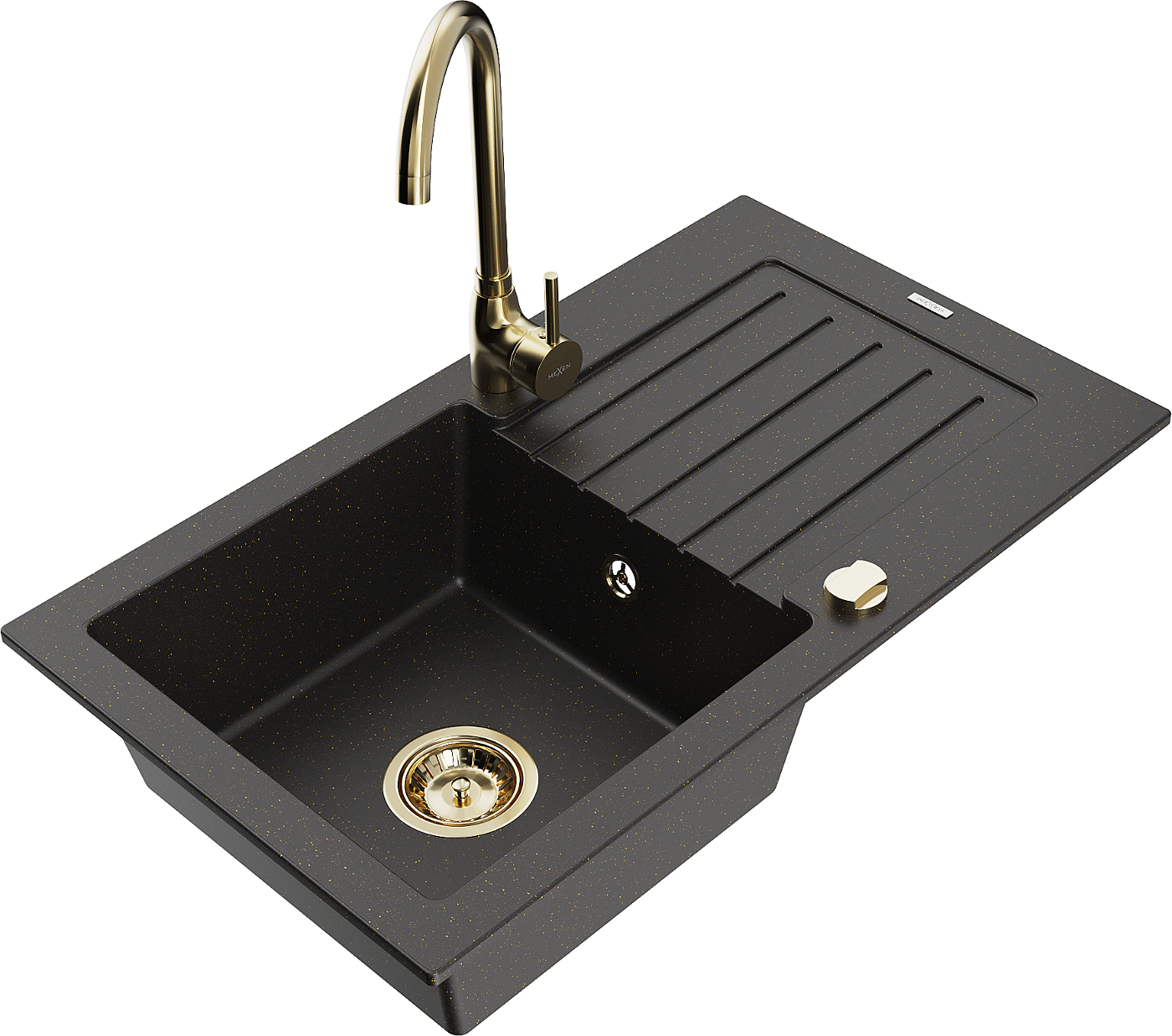 Mexen Pablo egymedencés gránit mosogató csepegtetővel és Telma konyhai csapteleppel, fekete/arany - 6510-75-670200-50