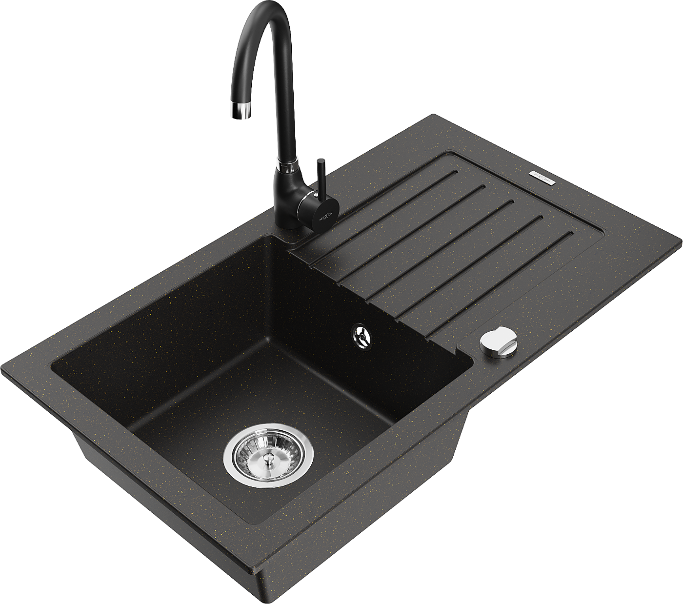 Mexen Pablo gránit mosogató 1-medencés csepegtetővel és Telma konyhai csapteleppel, fekete/arany - 6510-75-670200-70
