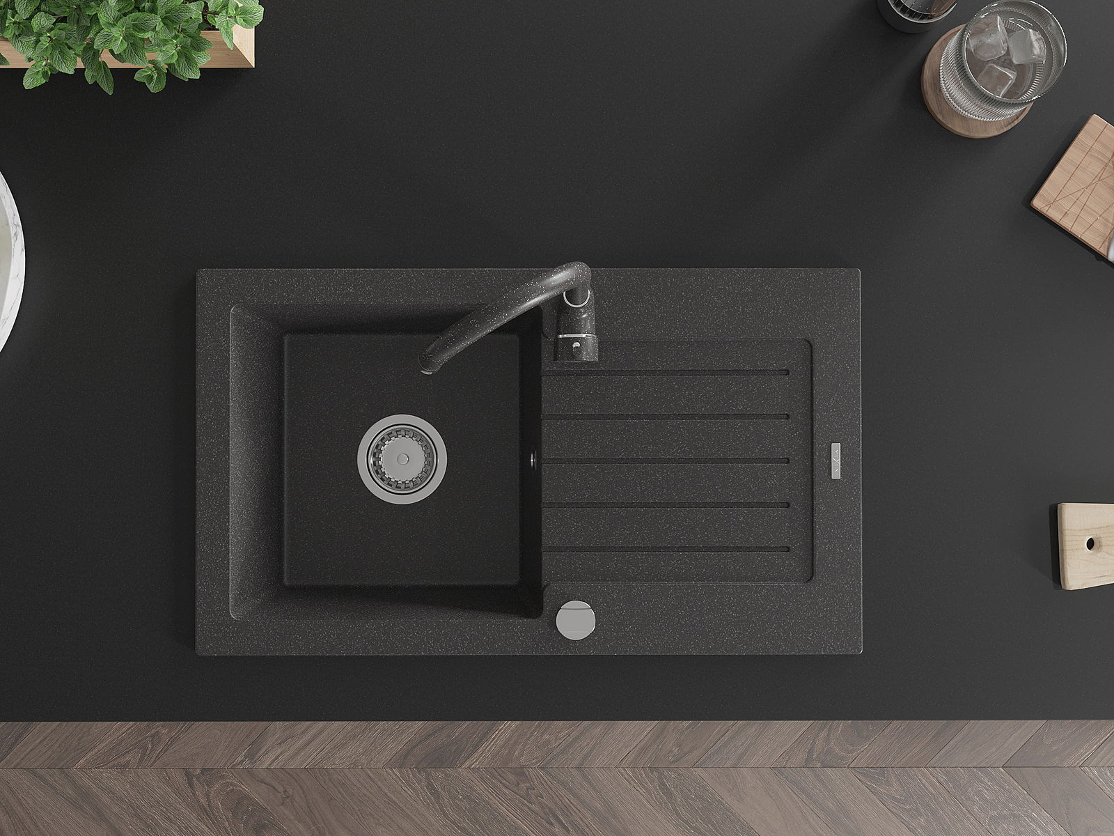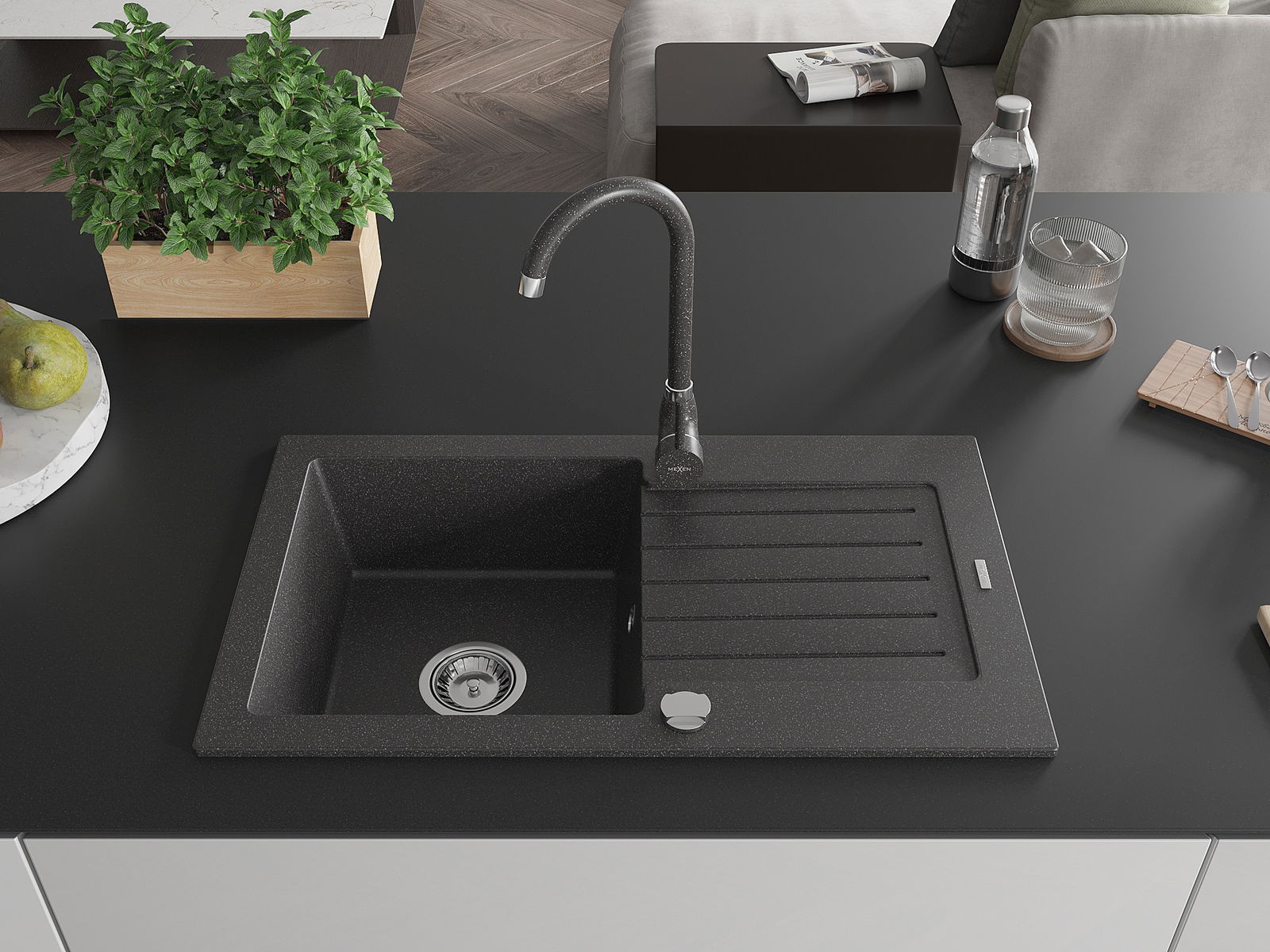 Mexen Pablo gránit mosogató 1-medencés csepegtetővel és Telma konyhai csapteleppel, fekete pöttyös - 6510-76-670200-76