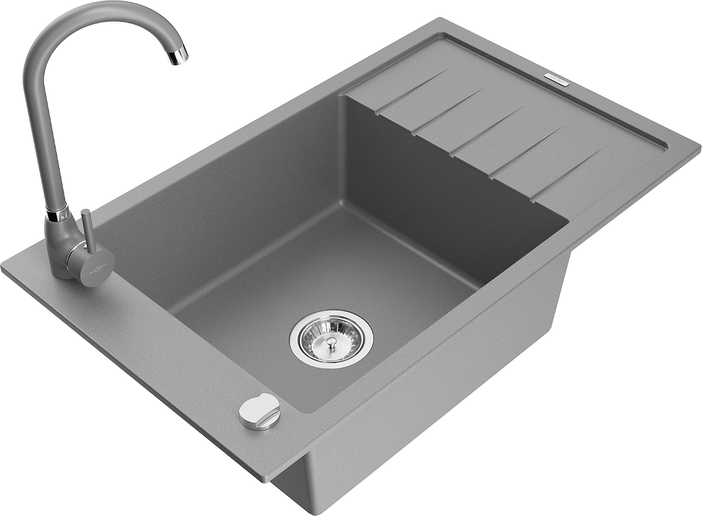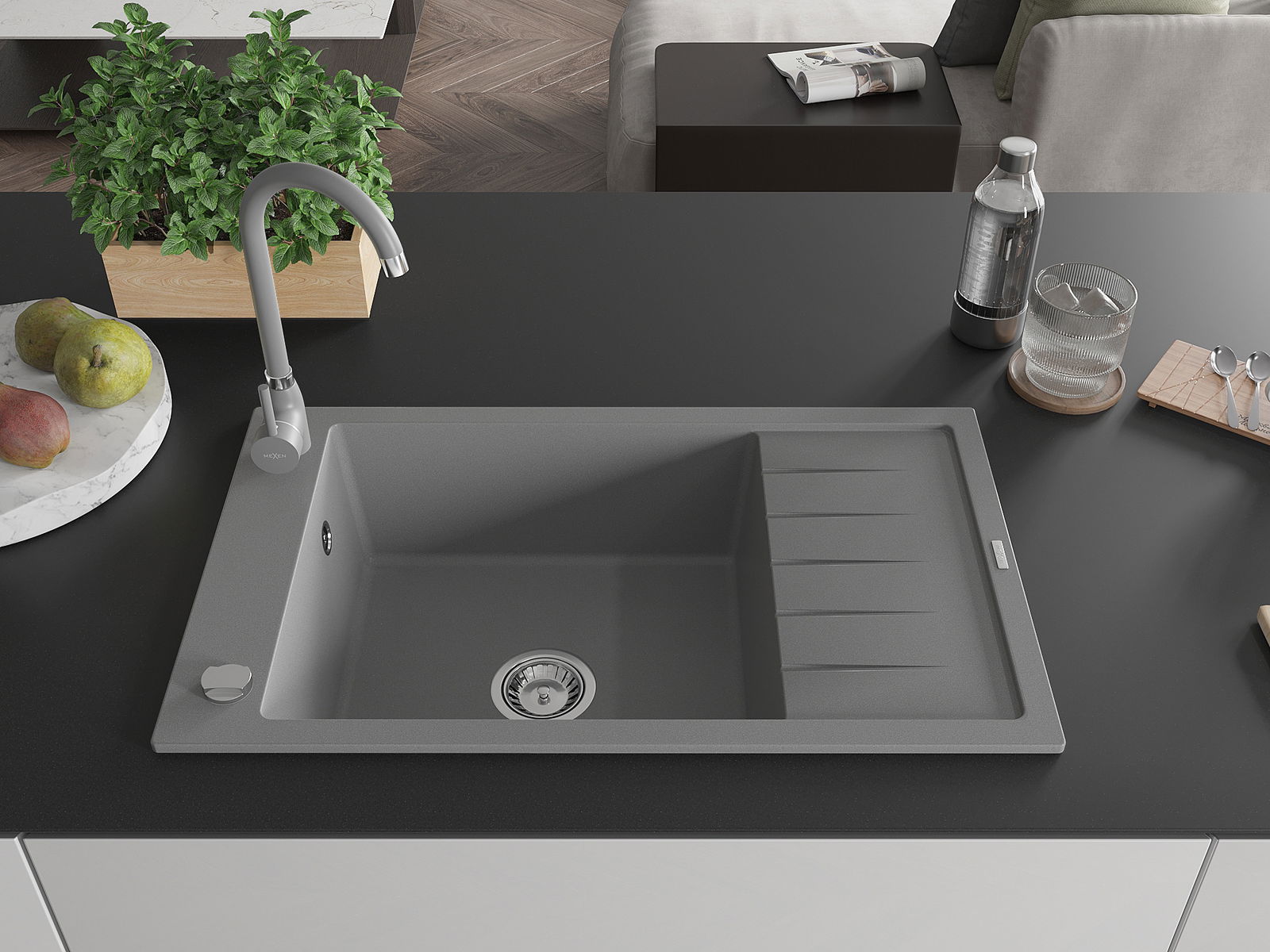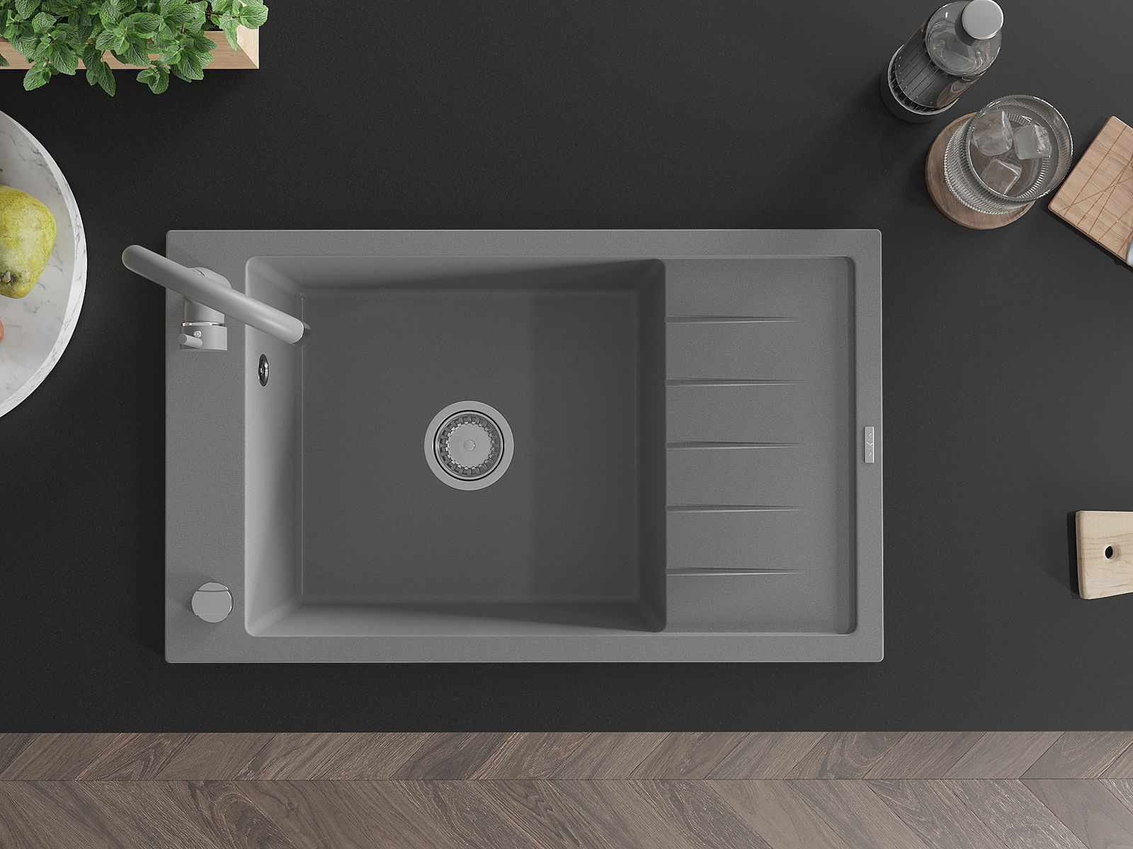 Mexen Elias gránit mosogató 1-medencés csepegtetővel és Telma konyhai csapteleppel, szürke - 6511-71-670200-71